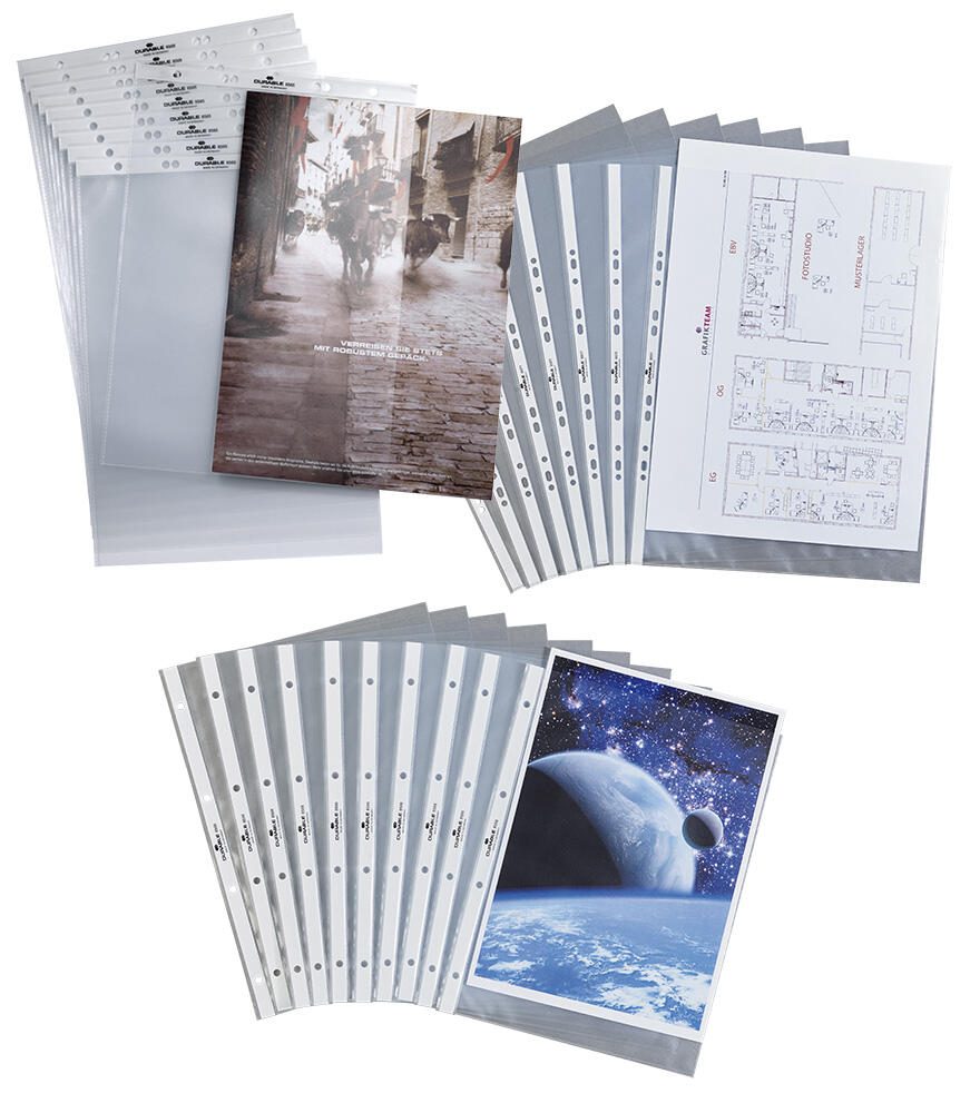 Die DURABLE Prospekthüllen im Format DIN A3 quer sind die ideale Lösung für die sichere und stilvolle Aufbewahrung deiner Dokumente. Mit einer Dicke von 0,12 mm bieten sie eine robuste und langlebige Struktur, die für den täglichen Gebrauch bestens geeignet ist. Diese transparenten Hüllen ermöglichen es dir, deine Unterlagen jederzeit im Blick zu behalten, während sie gleichzeitig vor Schmutz, Staub und Beschädigungen geschützt sind. Die seitliche Öffnung der Prospekthüllen erleichtert das Einlegen und Entnehmen von Dokumenten, sodass du schnell auf die benötigten Informationen zugreifen kannst. Dank des dokumentenechten Materials aus hochwertigem Polypropylen (PP) sind deine Unterlagen nicht nur sicher, sondern auch optimal vor Verfärbungen und Abnutzung geschützt. Die genarbte Oberfläche verleiht den Hüllen zusätzlich eine ansprechende Optik und sorgt dafür, dass sie sich gut in jede Präsentation oder Ablage einfügen. In jedem Pack sind 10 Stück enthalten, was dir eine praktische Möglichkeit bietet, mehrere Projekte oder Dokumente gleichzeitig zu organisieren. Durch den klaren, transparenten Farbton kannst du die Hüllen problemlos in jedem Büro oder Zuhause einsetzen, ohne dass sie von deinem individuellen Stil ablenken. Die DURABLE Prospekthüllen DIN A3 quer sind somit nicht nur funktional, sondern auch eine ästhetische Ergänzung für dein Arbeitsumfeld. Vertraue auf die Qualität und das durchdachte Design von DURABLE, um deine Dokumente professionell zu präsentieren und zu schützen.Technische Daten