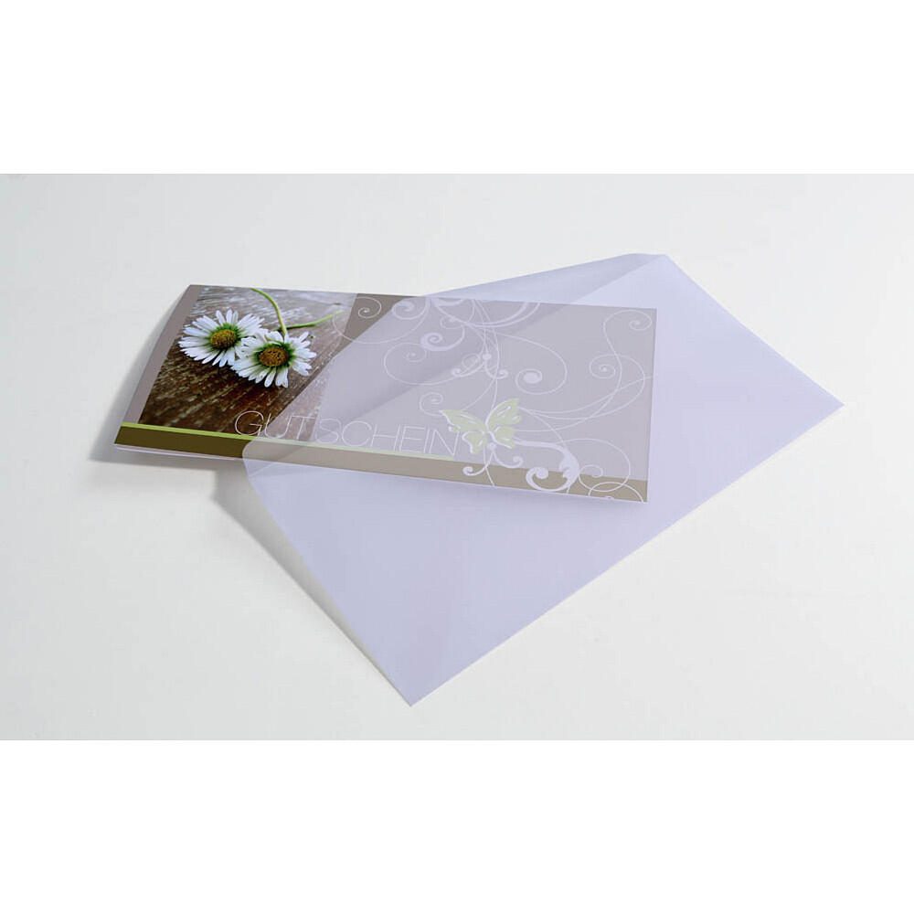 Umschlag transparent aus Spezialpapier, universell einsetzbar für alle Faltkarten DIN lang und A4-Papiere. Die gummierten Umschläge ohne Fenster sind für die Beschriftung mit InkJet- und Laser-Drucker sowie Kopierer geeignet. Im Lieferumfang sind 25 Stück im Format DIN lang enthalten.