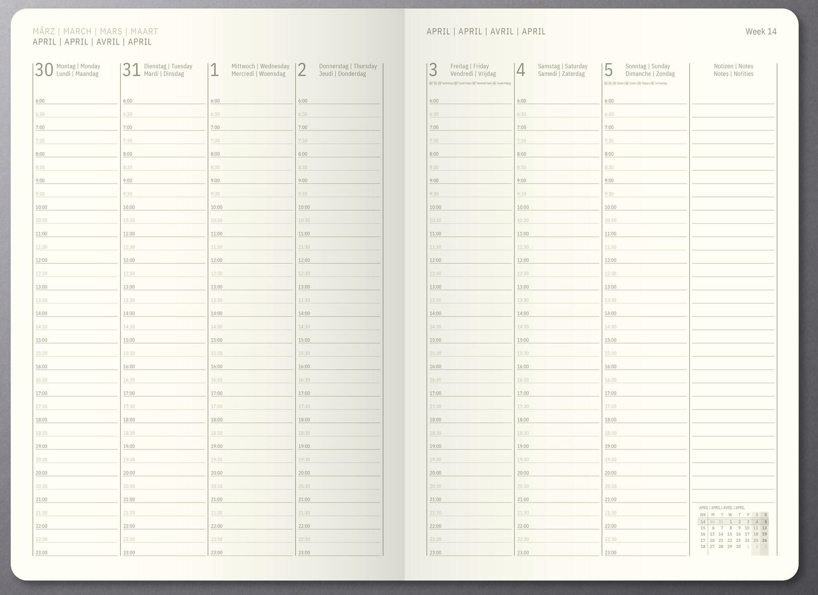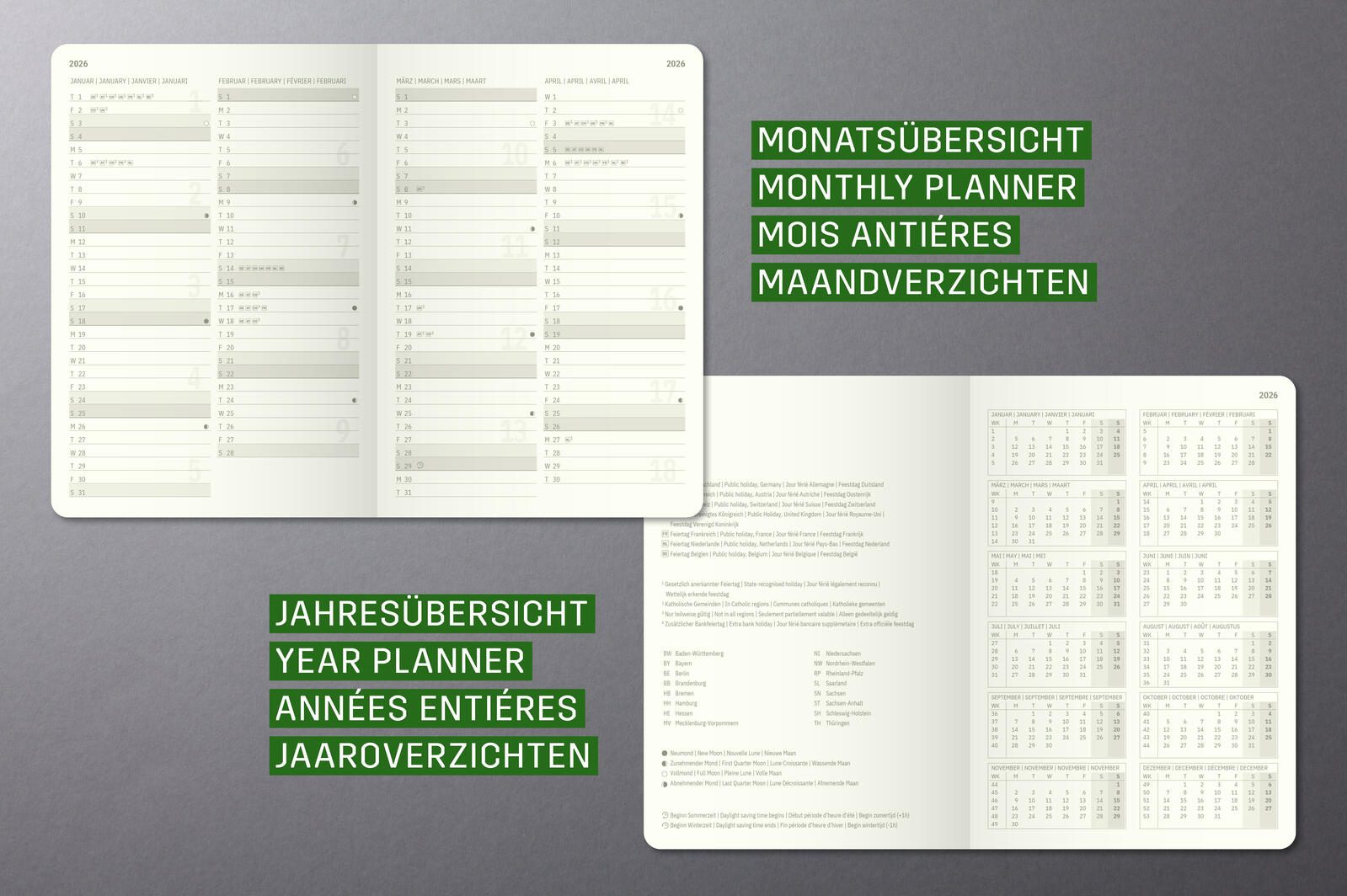 Das hochwertige cremefarbene Papier sorgt für eine angenehme Schreiboberfläche, während die Fadensiegelung als Bindung für eine stabile und langlebige Verarbeitung sorgt. Der Einband besteht aus robustem Kunststoff, der den Kalender vor Beschädigungen schützt. Ein Gummizugverschluss hält den Kalender sicher geschlossen und verhindert ein unbeabsichtigtes Aufklappen.