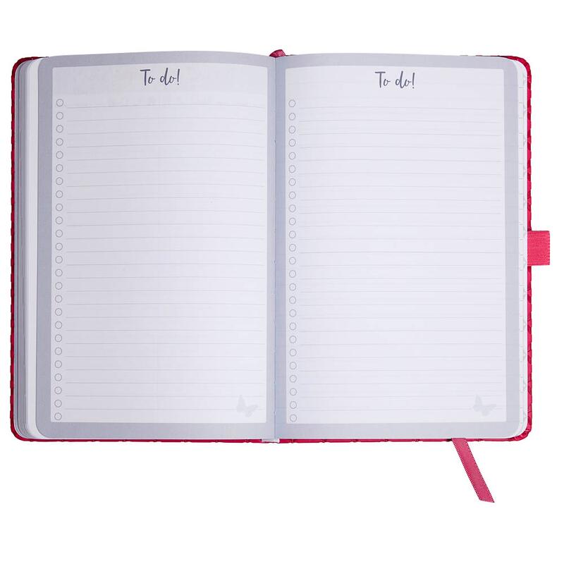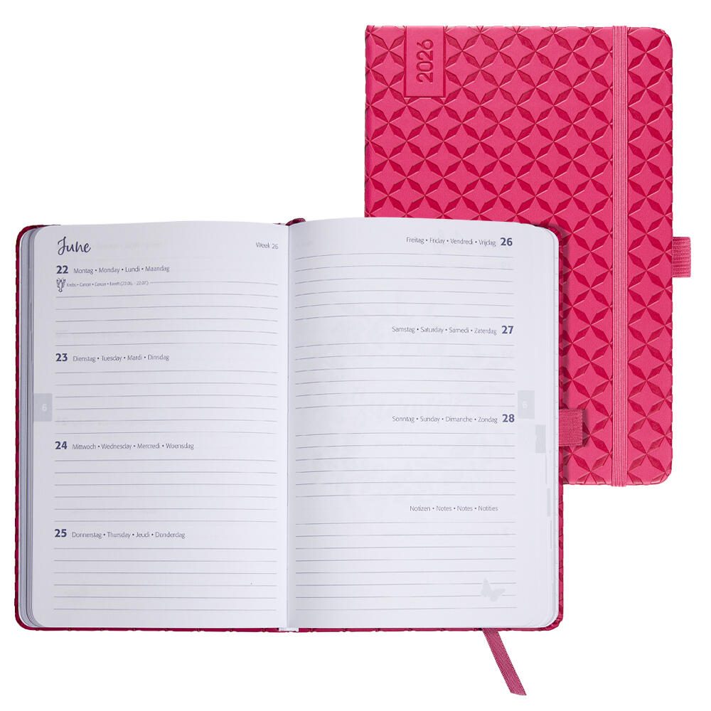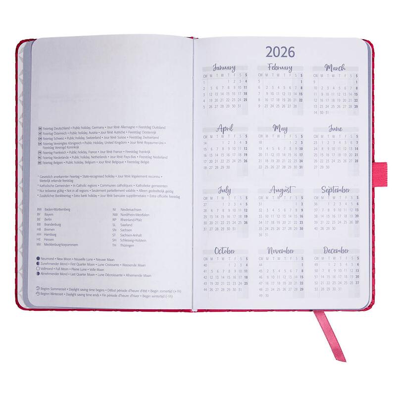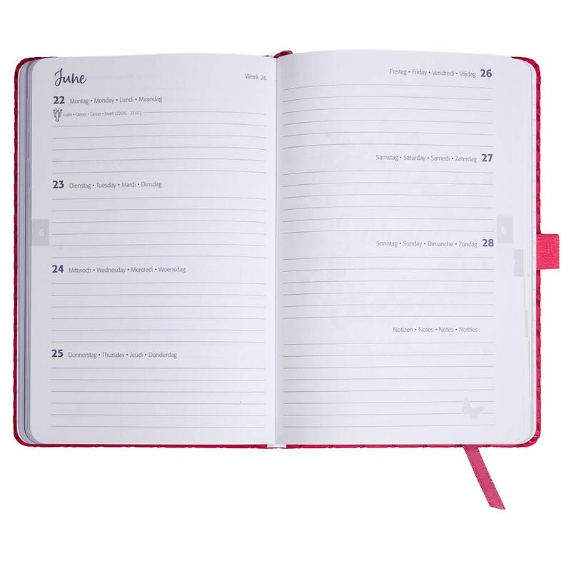 Das weiße Papier ist fadengesiegelt gebunden, was eine lange Haltbarkeit und eine flache Auflage des Kalenders ermöglicht. Die Wochenplanung ist übersichtlich gestaltet, sodass Du Deine Termine und Aufgaben einfach und strukturiert eintragen kannst. Ein Gummizugverschluss sorgt dafür, dass der Kalender sicher verschlossen bleibt und keine losen Blätter herausfallen.