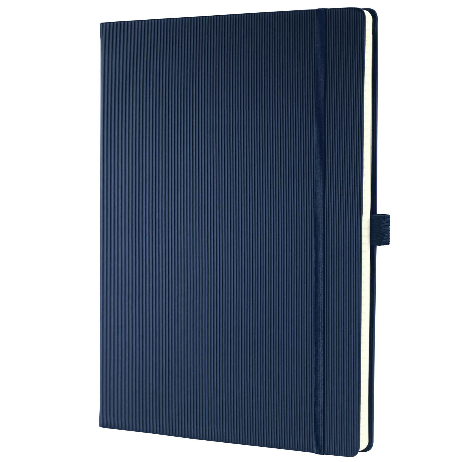 Das Notizbuch ist in einem dunkelblauen Einband gehalten und zeichnet sich durch seine hochwertige Fadensiegelung aus, die für eine stabile und langlebige Bindung sorgt. Das verwendete Material für die Seiten ist ECF-Papier, das holzfrei und somit besonders umweltfreundlich hergestellt ist. Zudem sind die Seiten mikroperforiert, was das einfache Herauslösen einzelner Blätter ermöglicht, ohne dass das restliche Notizbuch beschädigt wird.