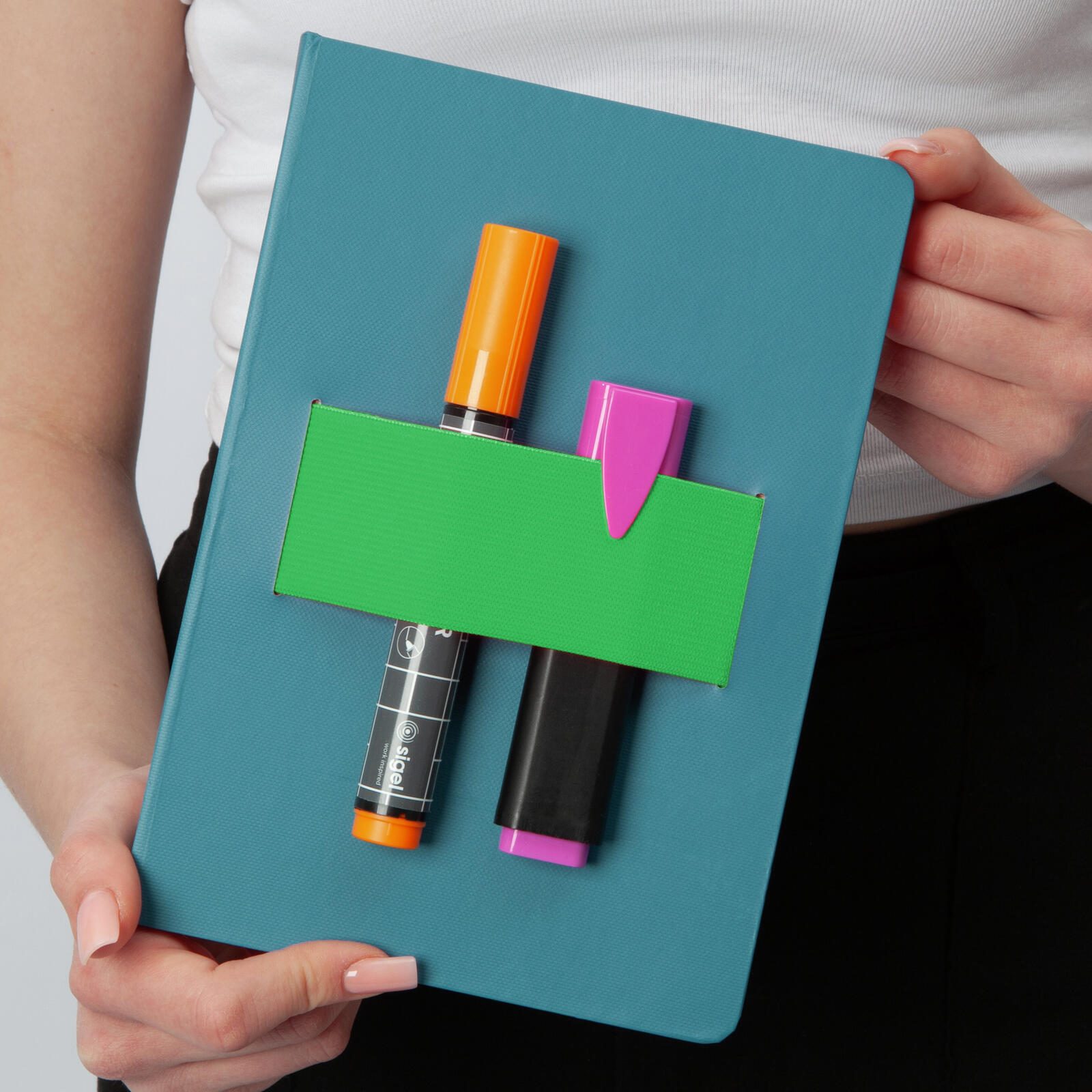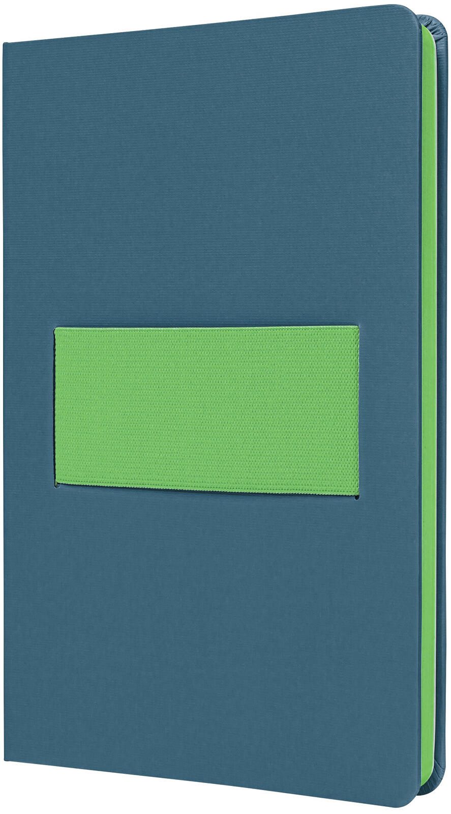 Die Bindung des Notizbuchs erfolgt durch eine Fadensiegelung, die für Stabilität und Langlebigkeit sorgt. Das Notizbuch ist in den Farbtönen mittelblau und neon-grün erhältlich, wodurch es sich optisch ansprechend präsentiert. Ein Verschluss ist nicht angegeben, somit ist das Notizbuch offen nutzbar.