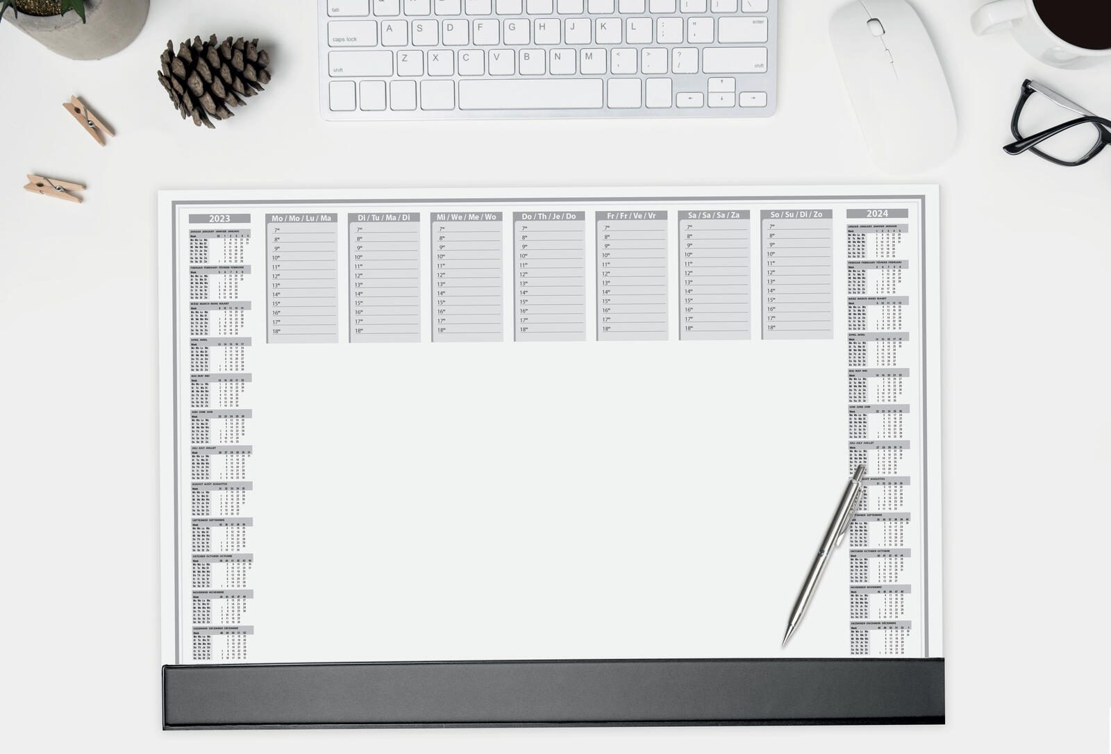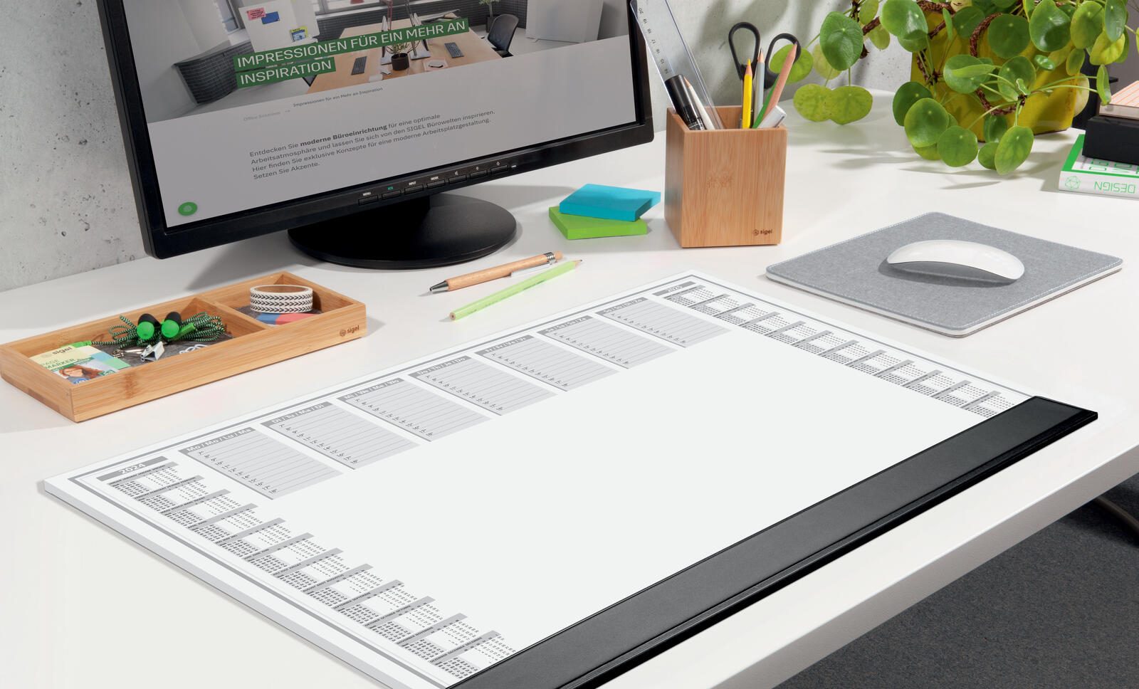 Die SIGEL Schreibtischunterlage in der Größe 59,5 x 41,0 cm vereint Funktionalität und ansprechendes Design. Mit ihrem eleganten weißen Farbton bietet sie nicht nur eine praktische Unterlage für deine Schreibarbeiten, sondern sorgt auch für eine stilvolle Gestaltung deines Arbeitsplatzes. Die Unterlage besteht aus hochwertigem Papier mit einem Gewicht von 80 g/m², was für eine angenehme Haptik und Langlebigkeit sorgt. Ein besonderes Merkmal dieser Schreibtischunterlage ist die schwarze Kunststoff-Schutzleiste, die nicht nur für zusätzliche Stabilität sorgt, sondern auch das Papier vor dem Ausfransen schützt. Mit insgesamt 40 Seiten bietet sie ausreichend Platz für Notizen, Termine und kreative Ideen. Das eingearbeitete Kalender-Motiv hilft dir dabei, den Überblick über wichtige Daten und Aufgaben zu behalten. Die Unterseite aus Karton gewährleistet eine rutschfeste Ablage und schützt deinen Tisch vor Kratzern. Egal, ob du im Home Office arbeitest, studierst oder einfach nur eine übersichtliche Schreibfläche benötigst, die SIGEL Schreibtischunterlage ist die ideale Lösung. Sie unterstützt dich dabei, organisiert zu bleiben und verleiht deinem Arbeitsplatz einen klaren, professionellen Look. Mit der SIGEL Schreibtischunterlage erhältst du ein praktisches und ästhetisches Produkt, das deinen Arbeitsalltag bereichert.Technische Daten