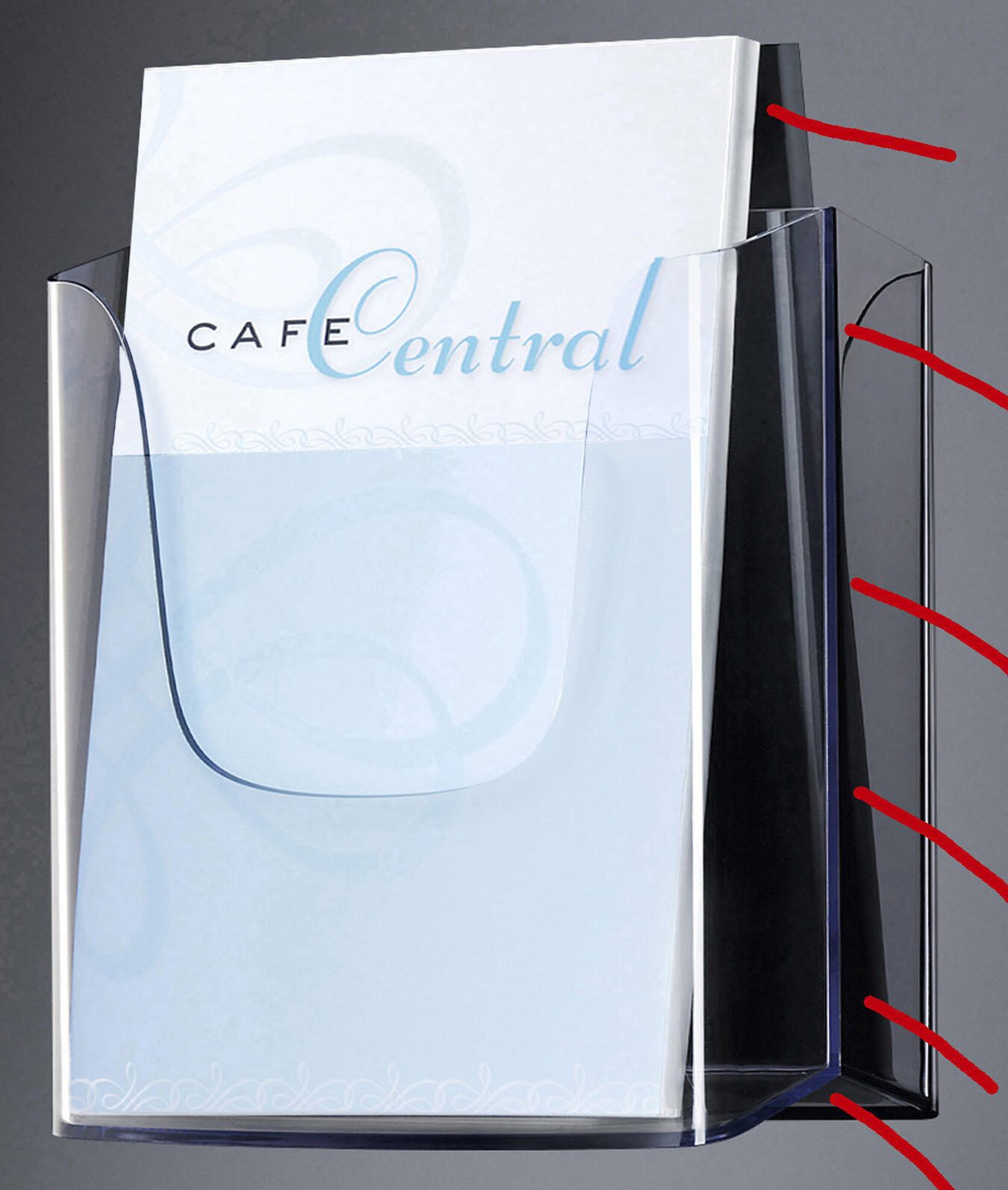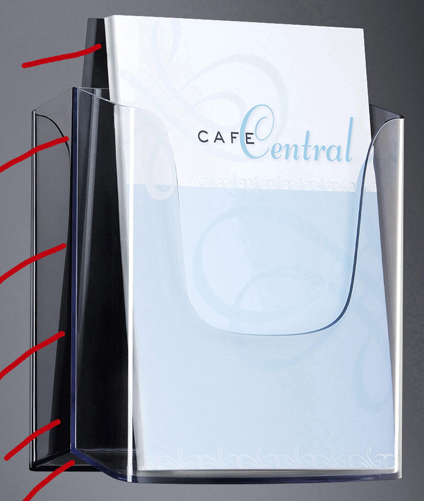 Ein Fach bietet genug Platz, um Broschüren, Produktkataloge oder Flyer in DIN A4-Format ordentlich zu präsentieren. Durch die transparente Farbe behalten potenzielle Kunden einen klaren Blick auf die Inhalte und können sich bequem informieren. Der Prospekthalter hält deine Unterlagen organisiert und griffbereit, was nicht nur die Präsentation verbessert, sondern auch deine Professionalität unterstreicht.