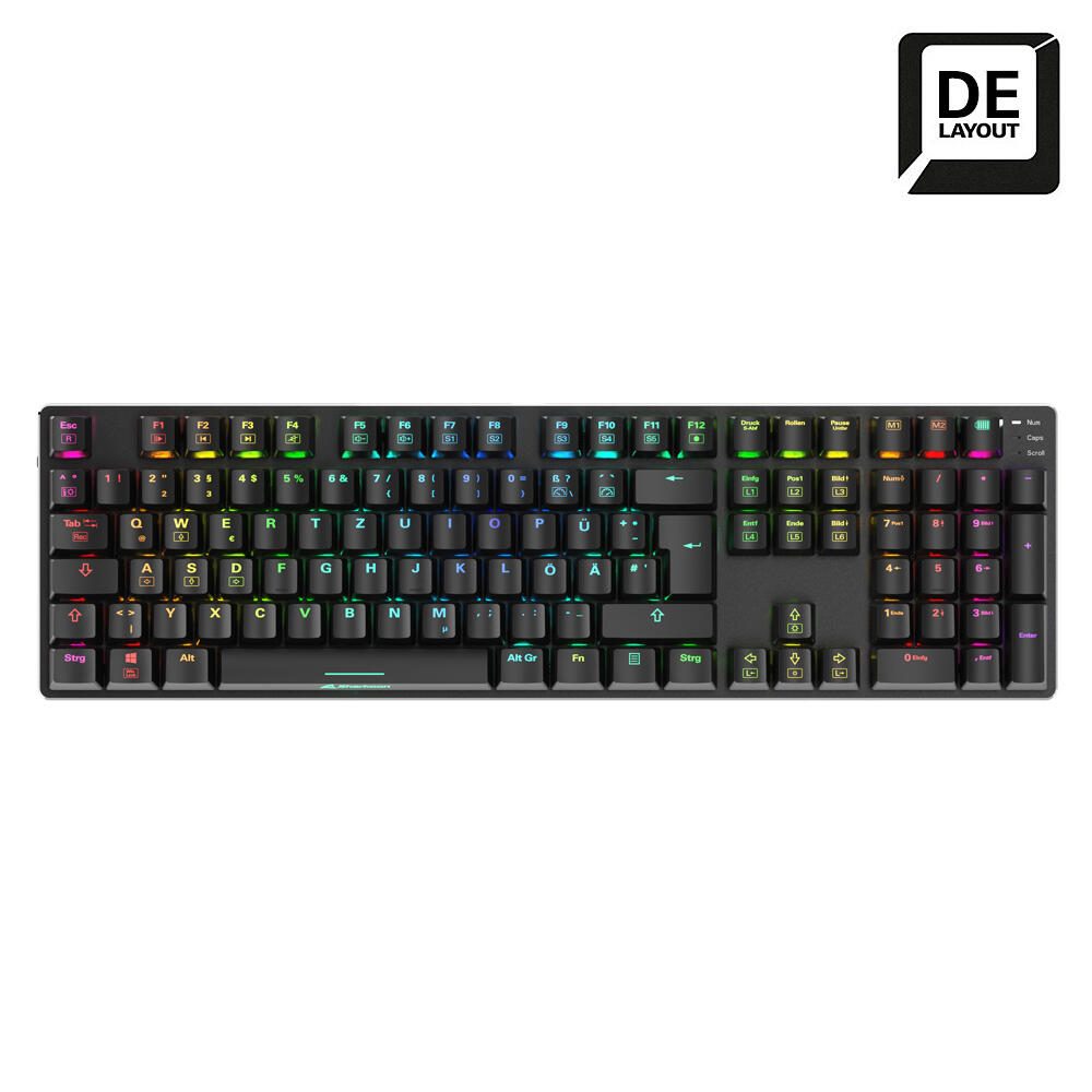 Anpassbare RGB-BeleuchtungDie RGB-Beleuchtung der Tastatur kann mittels Tastenkombinationen mit verschiedenen Effekten versehen oder spielend einfach angepasst und in fünf Beleuchtungsprofilen abgespeichert werden. Eine Software ist dafür nicht nötig. |