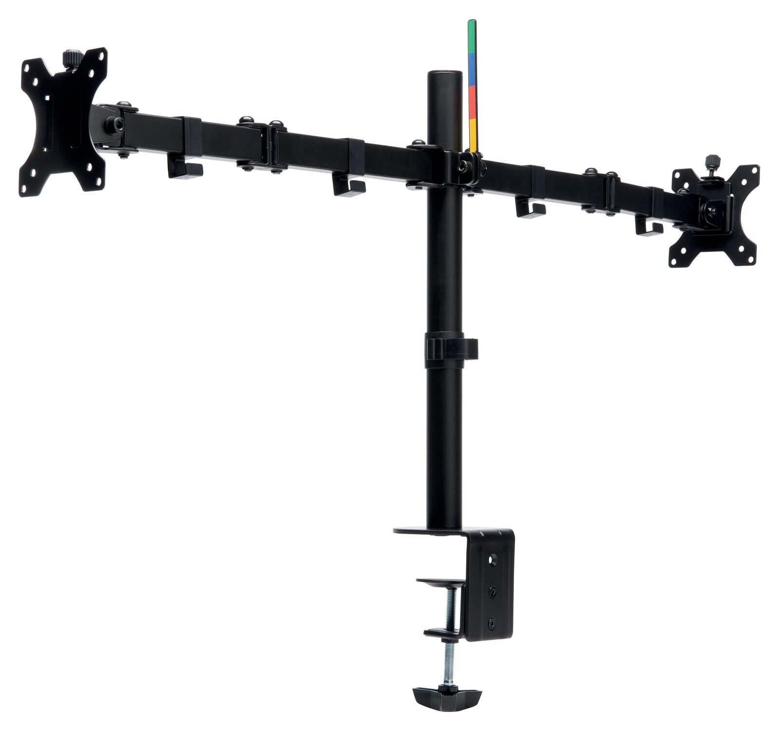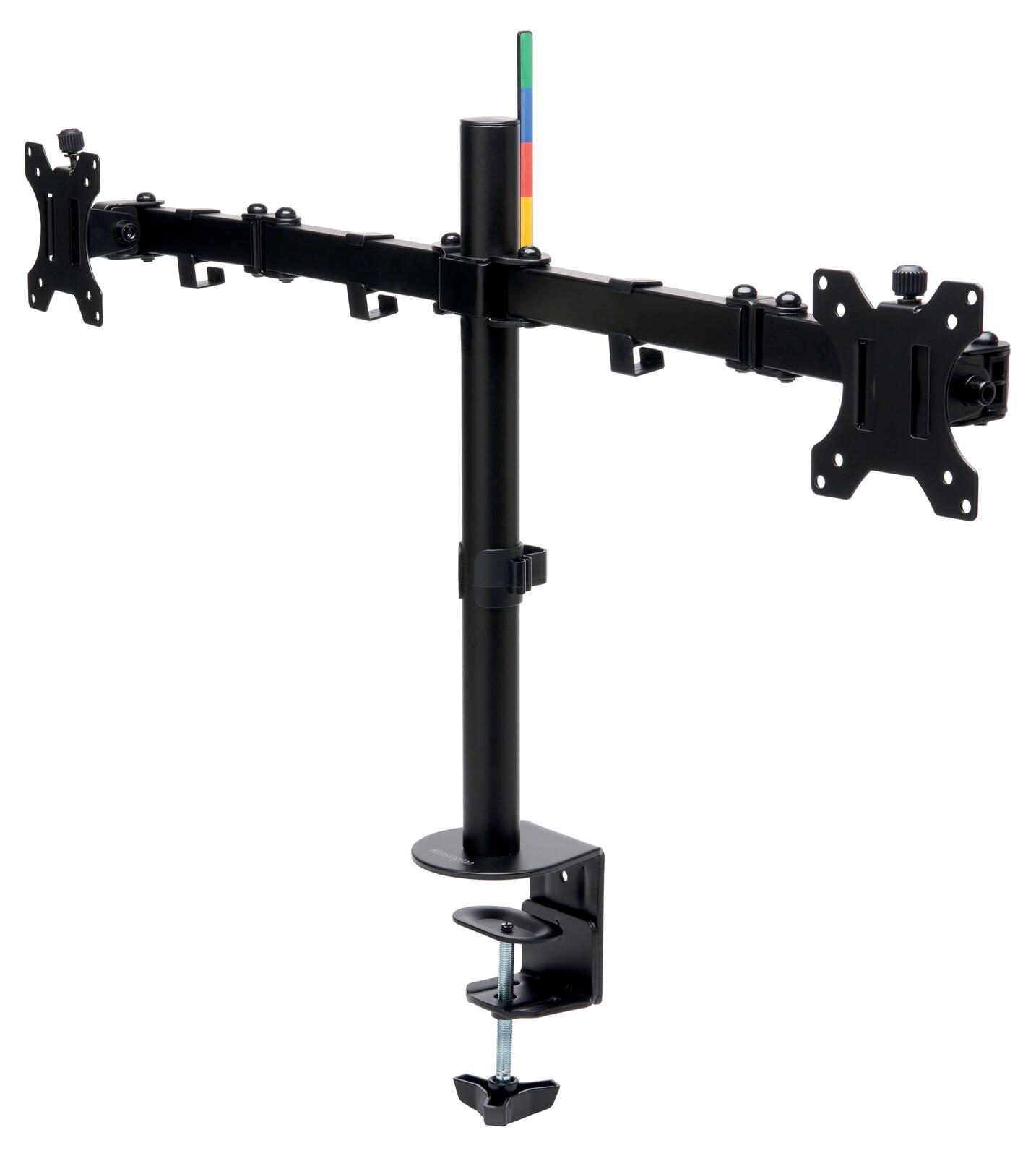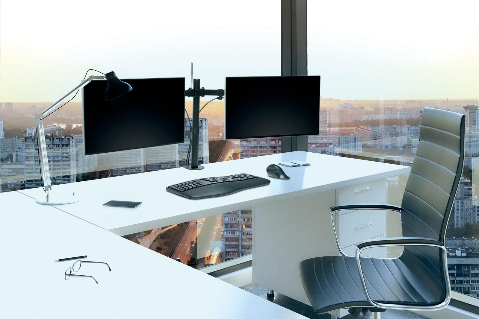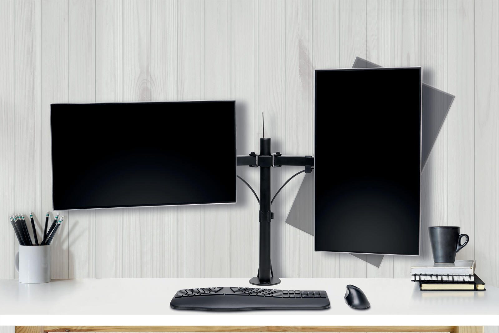 Die Neigung der Halterung reicht von -45° bis 45°, während die Rotation bis zu 180° und das Drehen bis zu 90° ermöglicht werden. Diese Flexibilität erlaubt es Ihnen, die Monitore optimal auszurichten, um Nacken- und Rückenschmerzen vorzubeugen. Darüber hinaus verfügt die Halterung über ein integriertes Kabelmanagementsystem, das für eine aufgeräumte und ordentliche Arbeitsumgebung sorgt.
