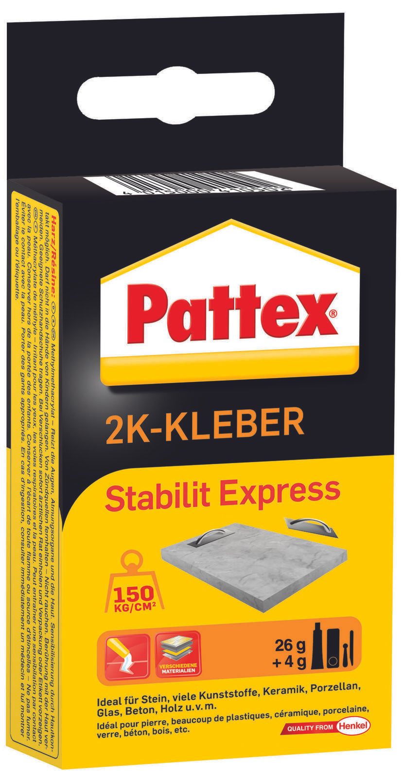 Der Pattex 2 Komponenten-Kleber ist die ideale Lösung für alle, die eine zuverlässige und dauerhafte Verbindung zwischen verschiedenen Materialien suchen. Mit einem Inhalt von 26,0 g Harz und 4,0 g Härtepulver bietet dieser Kleber eine leistungsstarke Formel, die sich schnell und einfach verarbeiten lässt. Die transparente Farbe sorgt dafür, dass die Klebestelle unauffällig bleibt, egal ob du Glas, Holz, Keramik, Kunststoff, Beton oder Stein miteinander verbinden möchtest. Ein herausragendes Merkmal des Pattex 2 Komponenten-Klebers ist seine permanente und wasserfeste Eigenschaft, die für eine langanhaltende Haltbarkeit sorgt. Egal, ob du ein Möbelstück reparieren, ein Kunstwerk gestalten oder ein Projekt im Außenbereich umsetzen möchtest, dieser Kleber hält den Herausforderungen des Alltags stand. Die schnelle Trocknungszeit ermöglicht es dir, deine Projekte zügig abzuschließen, ohne lange Wartezeiten in Kauf nehmen zu müssen. Die Anwendung des Pattex 2 Komponenten-Klebers ist denkbar einfach. Du mischst das Harz mit dem Härtepulver und trägst die Mischung auf die zu verbindenden Oberflächen auf. Nach der Aushärtung erhältst du eine extrem starke Verbindung, die auch hohen Belastungen standhält. Dieser Kleber ist somit die perfekte Wahl für Heimwerker, Bastler und Profis, die Wert auf Qualität und Zuverlässigkeit legen. Vertraue auf die Erfahrung von Pattex und entdecke die vielseitigen Einsatzmöglichkeiten des Stabilit Express 2 Komponenten-Klebers. Ob im Haushalt, bei Reparaturen oder kreativen Projekten – mit diesem Kleber bist du bestens ausgestattet, um deine Ideen in die Tat umzusetzen.Technische Daten