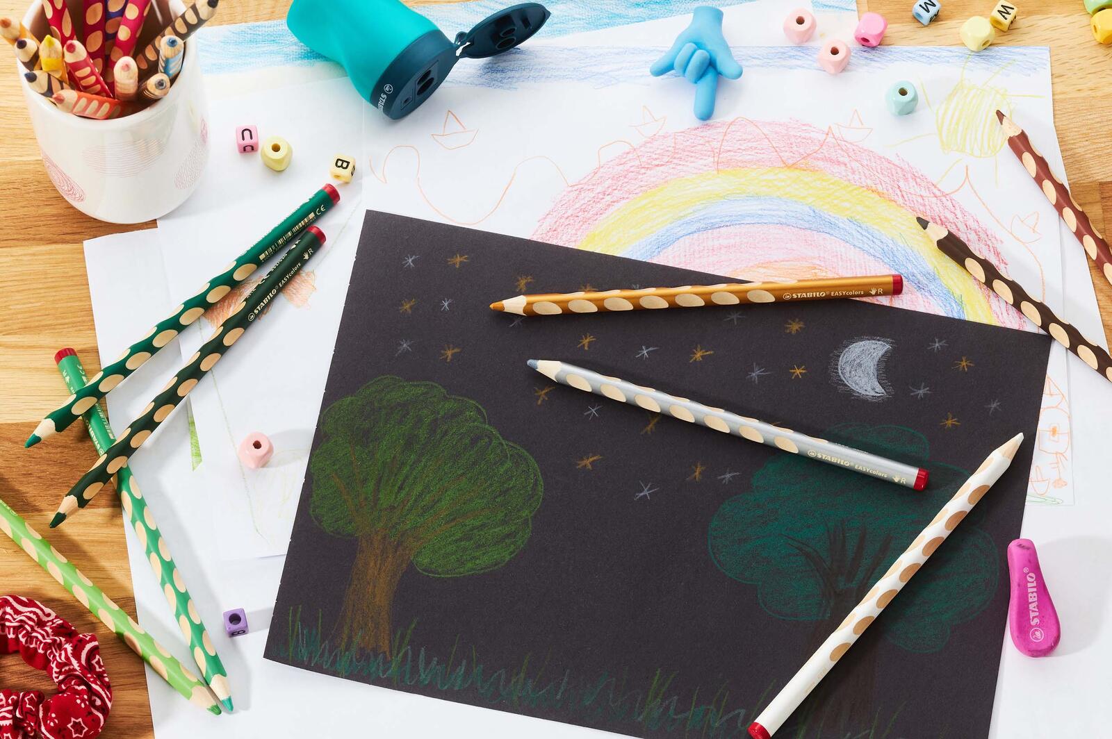 Die STABILO Buntstifte EASYcolors L sind ein Set aus 12 farbigen Stiften, die sich durch ihre hohe Minenstabilität und Bruchfestigkeit auszeichnen. Sie sind speziell für ein angenehmes und sicheres Malen und Zeichnen konzipiert. Die Stifte besitzen eine dreikantige Form, die eine ergonomische Handhabung ermöglicht und das Abrutschen während des Zeichnens verhindert.