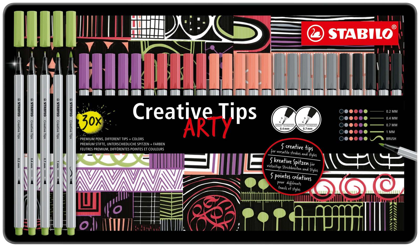 Die STABILO Filzstifte ARTY PASTEL sind ein Set aus 30 farbigen Stiften, die in einem praktischen Metall-Etui geliefert werden. Die Stifte besitzen eine runde Spitze, die verschiedene Strichstärken von 0,2 bis 1,0 Millimeter sowie eine Brush-Spitze ermöglicht. Diese Vielfalt erlaubt eine flexible Anwendung, von feinen Linien bis zu ausdrucksstarken Pinselstrichen.