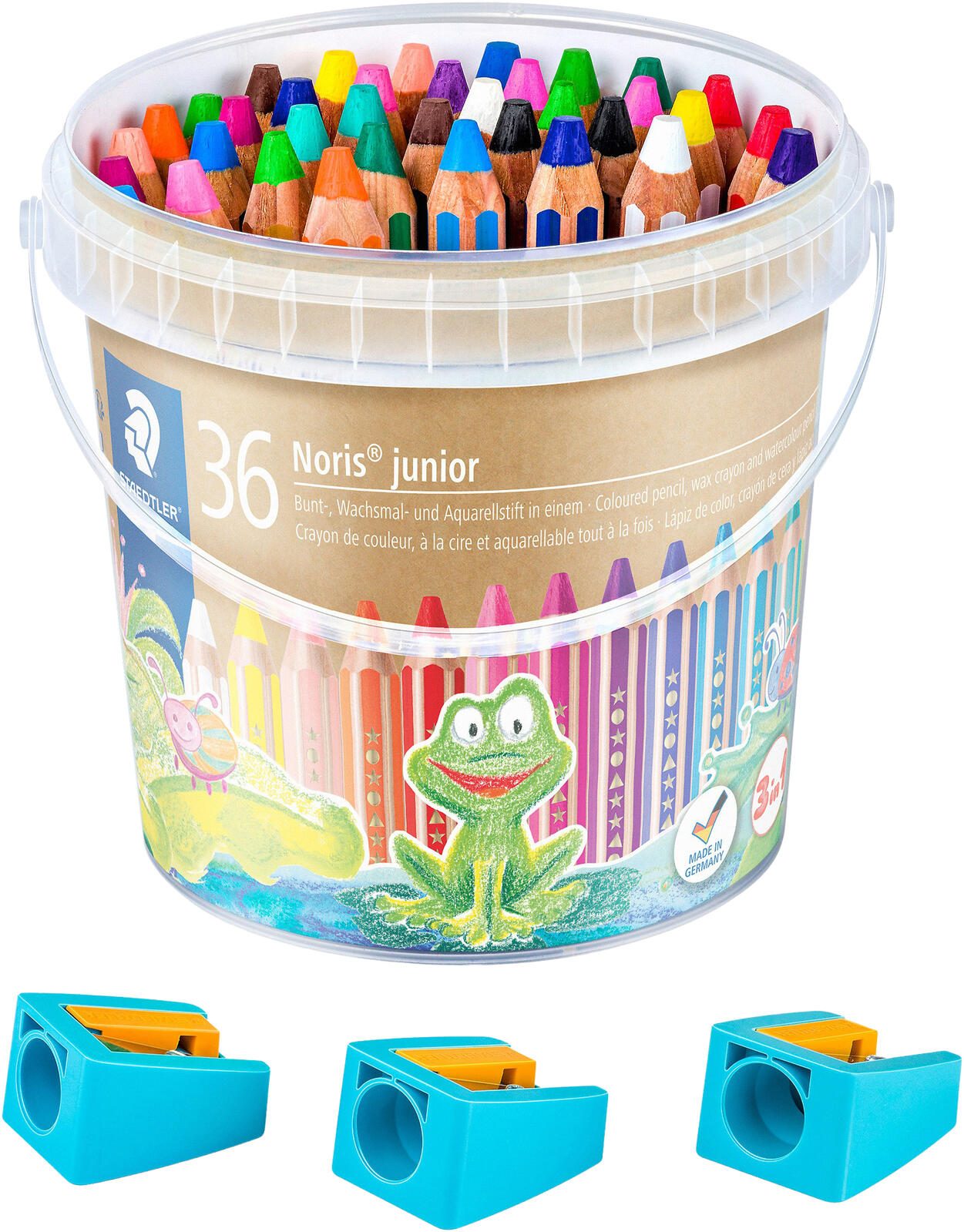 Die STAEDTLER Noris junior Buntstifte bieten mit 36 verschiedenen Farben eine besonders vielfältige Auswahl für kreative Gestaltungsmöglichkeiten. Die Stifte sind in einem praktischen Eimer verpackt, der nicht nur die Aufbewahrung erleichtert, sondern auch den Transport komfortabel macht. Die sechskantige Form sorgt für eine angenehme Handhabung und verhindert ein Wegrollen auf dem Tisch, was besonders für Kinderhände ideal ist.