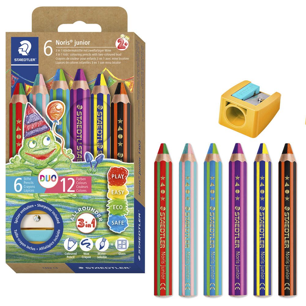 Die STAEDTLER Noris® junior 1402 duo Buntstifte sind speziell für Kleinkinder entwickelt. Sie bieten eine kindgerechte Handhabung durch ihre sechskantige Form, die ein angenehmes und sicheres Greifen ermöglicht. Die Stifte sind in einem Karton-Etui verpackt, das sechs farbsortierte Buntstifte sowie einen praktischen Spitzer enthält.