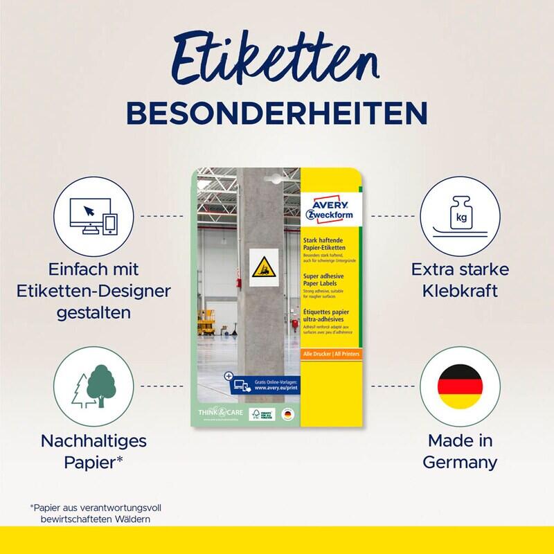 Die AVERY Zweckform Power-Etiketten sind chlorfrei gebleicht und somit umweltfreundlich. Zudem sind sie lösungsmittelfrei, was sie zu einer sicheren Wahl für den Einsatz in Haushalten und Büros macht. Die Etiketten sind selbstklebend und lassen sich einfach anbringen, ohne dass eine Ablösehilfe erforderlich ist. Ihre blickdichte Beschaffenheit sorgt dafür, dass der Untergrund nicht durchscheint, was besonders bei der Verwendung auf farbigen oder gemusterten Oberflächen vorteilhaft ist.