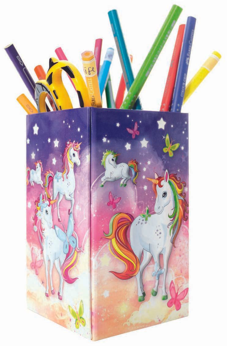 Der HERMA Stiftehalter im zauberhaften Einhorn-Design bringt nicht nur Ordnung auf deinen Schreibtisch, sondern verleiht deinem Arbeitsplatz auch einen Hauch von Magie. Mit seinen kompakten Maßen von 8,0 x 8,0 x 13,5 cm ist dieser Stiftehalter perfekt geeignet, um deine Lieblingsstifte, Marker oder andere Schreibutensilien stilvoll zu präsentieren und stets griffbereit zu haben. Gefertigt aus hochwertigem Karton, überzeugt der Stiftehalter durch seine Stabilität und Langlebigkeit. Das einzigartige Einhorn-Motiv sorgt dafür, dass er nicht nur funktional ist, sondern auch als dekoratives Element in jedem Raum wirkt. Egal, ob im Kinderzimmer, im Büro oder im kreativen Atelier – der HERMA Stiftehalter wird zum Blickfang und bringt Freude in deinen Alltag. Mit einem Fach bietet der Stiftehalter ausreichend Platz für deine wichtigsten Schreibgeräte, während das ansprechende Design dafür sorgt, dass er in jeder Umgebung harmonisch integriert werden kann. Der HERMA Stiftehalter ist nicht nur praktisch, sondern auch ein ideales Geschenk für Einhorn-Liebhaber und kreative Köpfe. Tauche ein in die Welt der Fantasie und lasse dich von der charmanten Ausstrahlung des HERMA Stiftehalters inspirieren. Dieser Stiftehalter ist mehr als nur ein Aufbewahrungsort für Stifte – er ist ein Ausdruck deiner Persönlichkeit und ein stilvolles Accessoire für jeden Schreibtisch.Technische Daten