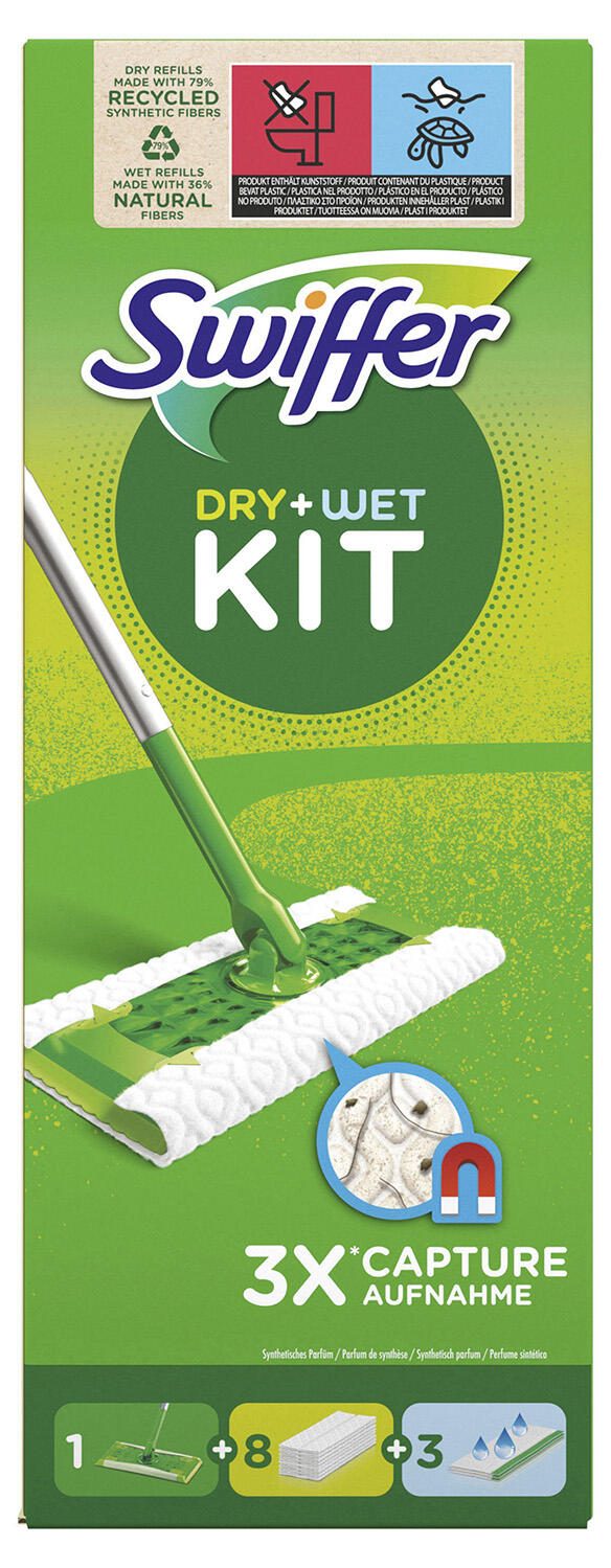 - Setumfang: 1 Bodenwischer, 8 trockene Bodentücher, 3 feuchte Bodentücher