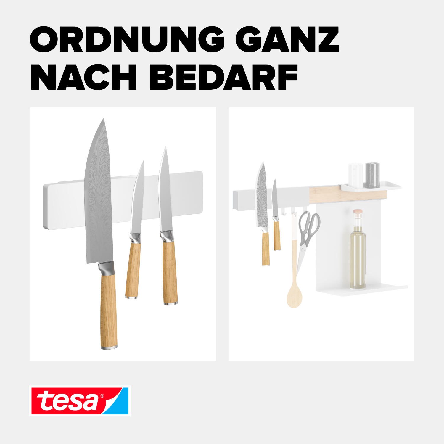 Mit dem tesa® Messerhalter weiß profitieren Sie von einer Kombination aus durchdachtem Design, einfacher Montage und sicherem Halt, die den Küchenalltag erleichtert und für mehr Ordnung sorgt.
