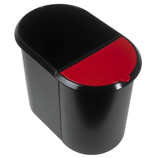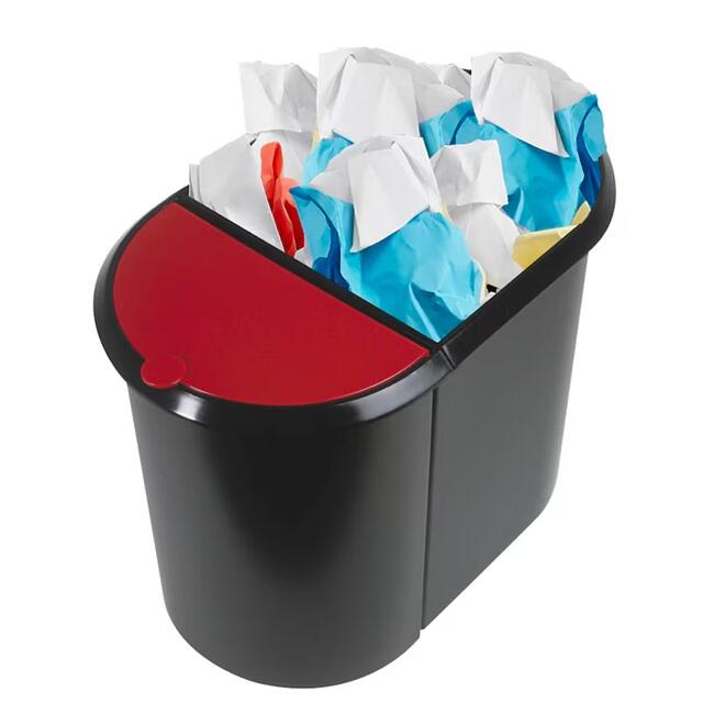 Der helit Mülltrenner 20,0 + 9,0 l in elegantem Schwarz vereint Funktionalität mit ansprechendem Design und ist die ideale Lösung für eine umweltbewusste Abfalltrennung im Innenbereich. Mit einem großzügigen Fassungsvermögen von 20 Litern für Papier und 9 Litern für nasse und sonstige Abfälle bietet dieser Mülltrenner ausreichend Platz für deine alltäglichen Abfälle. Die durchdachte Ausführung mit umlaufendem Griffrand ermöglicht ein einfaches Handling und eine komfortable Entleerung. Der integrierte Tretmechanismus sorgt dafür, dass du den Deckel hygienisch öffnen kannst, ohne ihn mit den Händen berühren zu müssen. Der Klappdeckel aus hochwertigem Polystyrol garantiert eine einfache Handhabung und schützt den Inhalt vor unangenehmen Gerüchen. Das Material des Mülltrenners ist robust und langlebig, was ihn zu einem idealen Begleiter für den Innenbereich macht. Die Kombination aus Kunststoff und dem ansprechenden Farbton Schwarz verleiht dem Produkt nicht nur eine moderne Optik, sondern sorgt auch dafür, dass es sich harmonisch in jede Raumgestaltung einfügt. Der rote Deckel setzt zudem einen attraktiven Farbakzent und erleichtert die Zuordnung der Abfallarten. Mit Abmessungen von 44,5 x 28,0 cm nimmt der helit Mülltrenner nicht zu viel Platz ein und passt perfekt in Küchen, Büros oder andere Innenräume. Die durchdachte Konstruktion und das ansprechende Design machen diesen Mülltrenner zu einer praktischen und stilvollen Wahl für jeden Haushalt oder Arbeitsplatz, der Wert auf Ordnung und Umweltschutz legt.Technische Daten