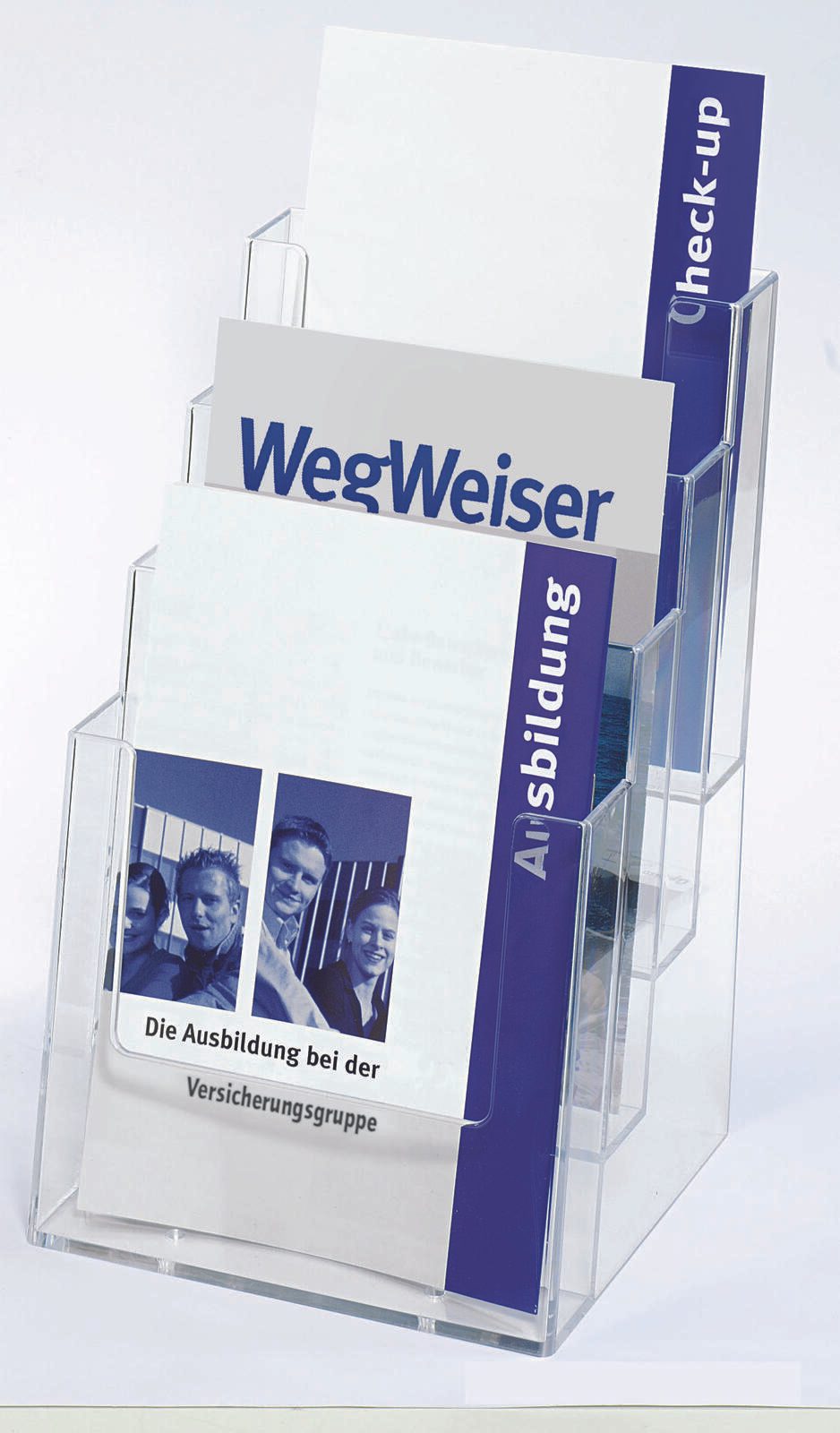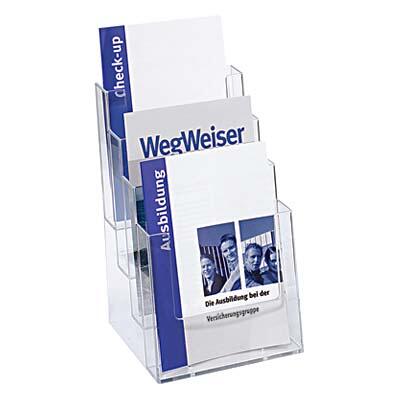 Die Ausführung mit Griffzone macht es einfach, den Prospekthalter zu transportieren und flexibel zu platzieren. Diese Eigenschaften machen ihn ideal für den Einsatz in Büros, Warteräumen, Messen oder anderen Orten, an denen Informationen griffbereit präsentiert werden sollen.