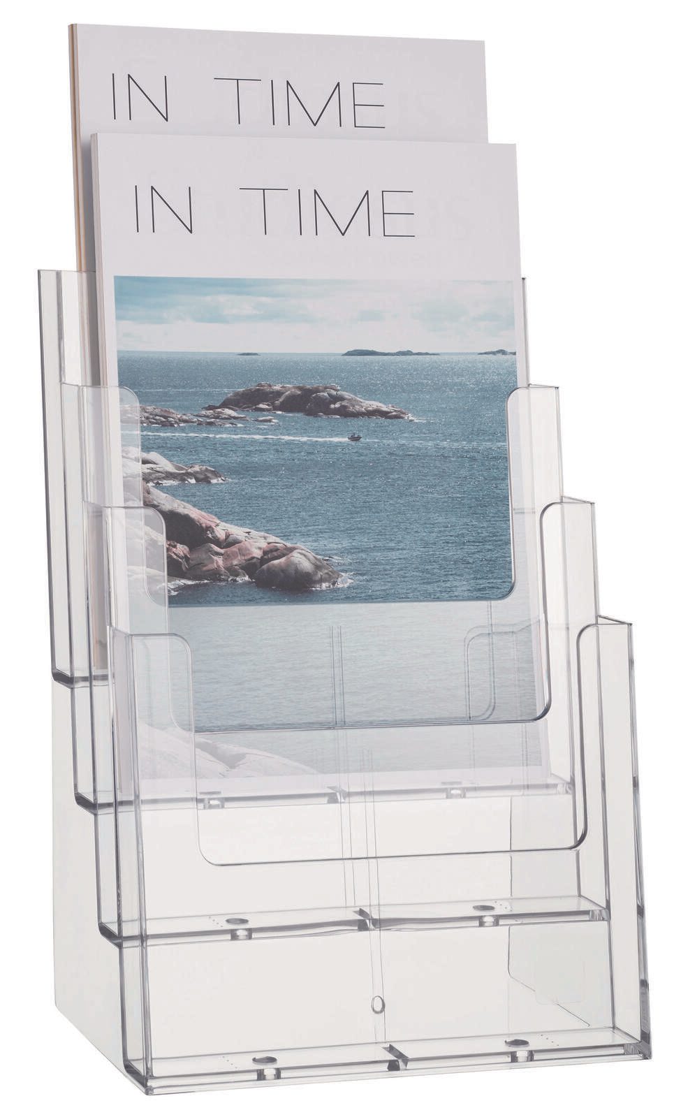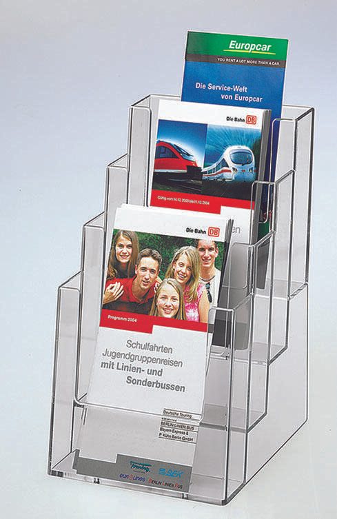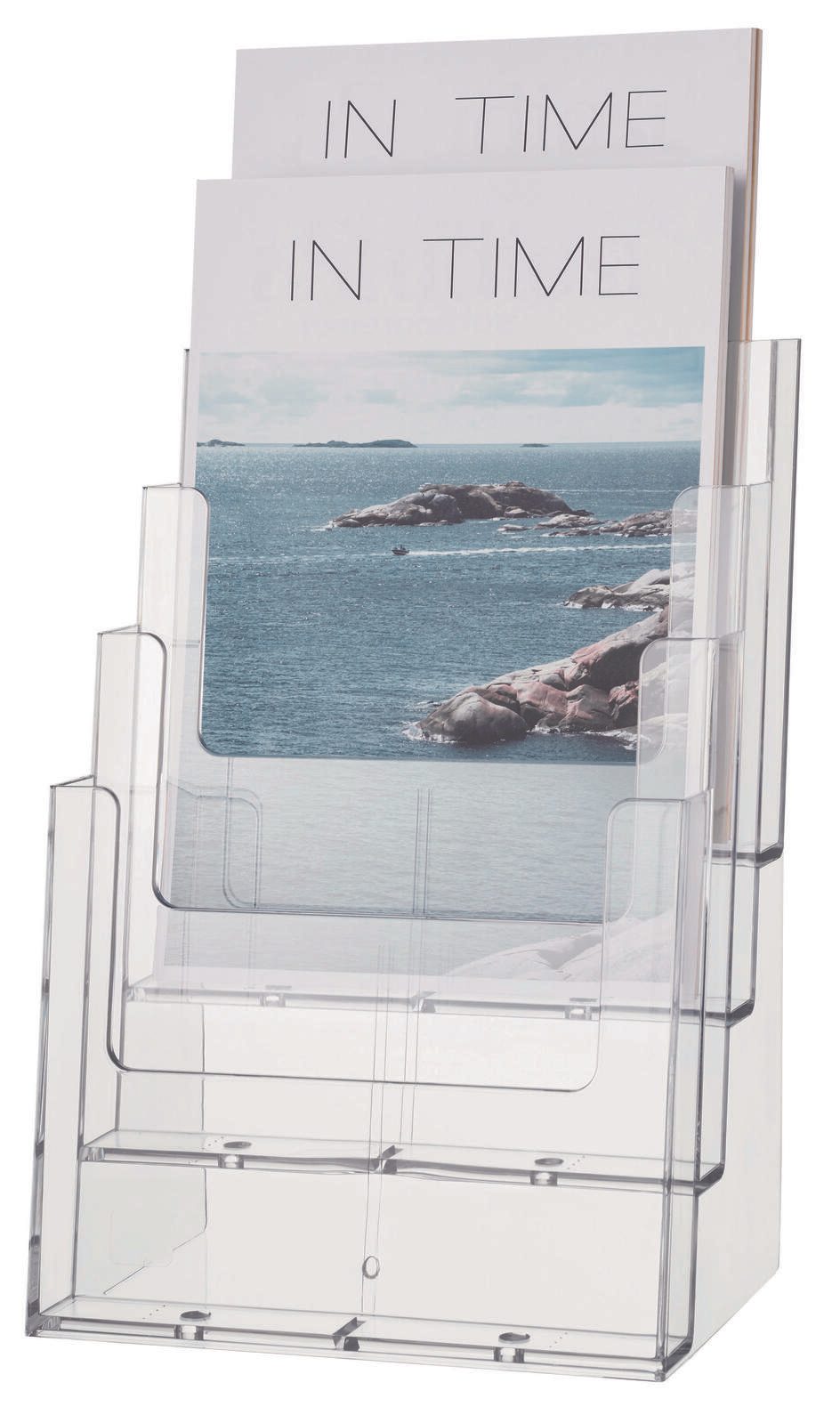 Der helit Tischprospekthalter Tischprospekth. 4x A5 präsentiert sich als praktische Lösung für die übersichtliche Aufbewahrung von Prospekten im Innenbereich. Dank seiner transparenten Farbe fügt er sich dezent in jedes Umfeld ein. Mit insgesamt 4 Fächern bietet dieser Prospekthalter aus Polystyrol ausreichend Platz für A5-Formate.