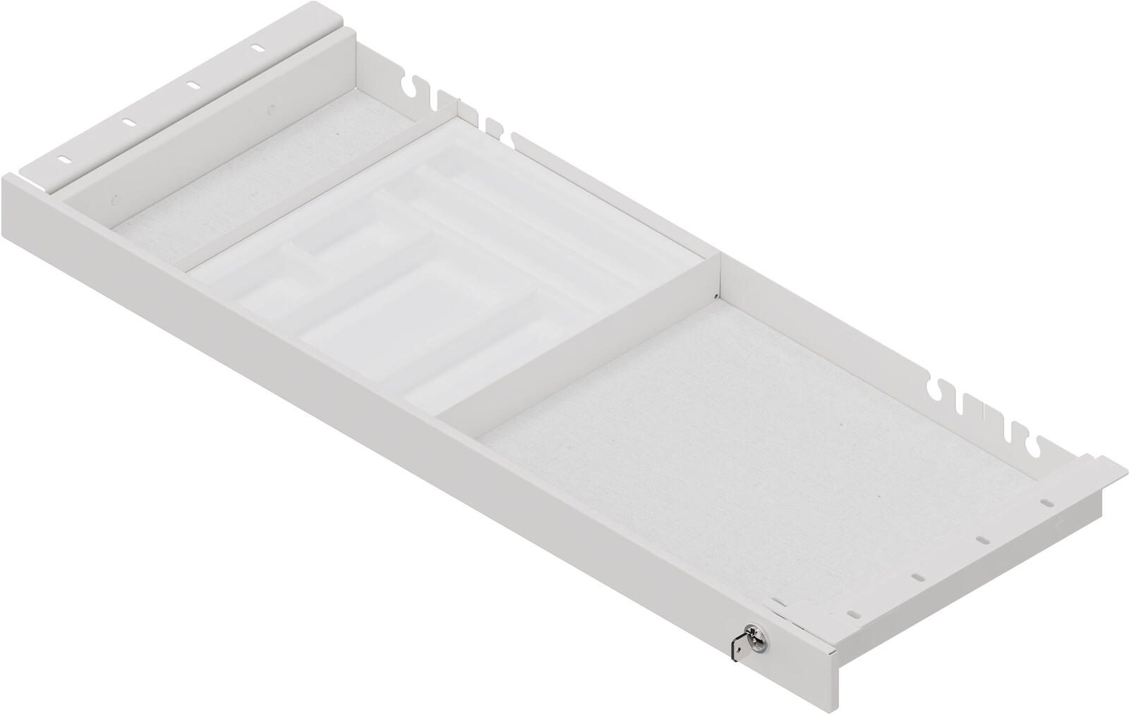 Die Schublade verfügt zudem über eine praktische Utensilienschale mit den Maßen 26,0 x 30,0 x 2,6 cm (BxTxH), um Kleinteile ordentlich zu verstauen. Der weiße Farbton passt perfekt zu verschiedenen Schreibtischdesigns und verleiht deinem Arbeitsbereich eine moderne Note.