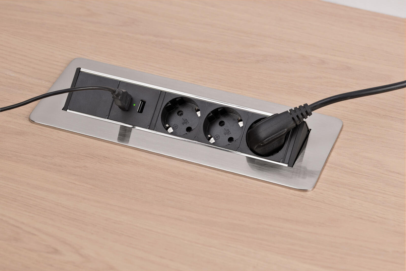Die Tischsteckdose eignet sich ideal für den Einsatz im Innenbereich und wird ohne Fußtaster geliefert. Mit einem Ausschnittmaß von 27,6 x 9,3 cm lässt sich die Halterung problemlos montieren, um dir eine komfortable Nutzung zu ermöglichen.