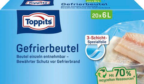 Die Toppits Gefrierbeutel sind ein Teil der Haushaltsutensilien und werden von der Cofresco Frischhalteprodukte GmbH & Co. KG hergestellt. Sie verbinden Funktionalität mit einfacher Handhabung und sind eine verlässliche Lösung zur Lebensmittelaufbewahrung im Gefrierbereich.
