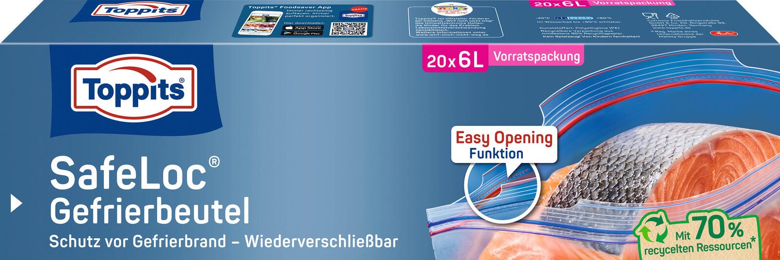 Im Lieferumfang ist eine Packung mit 20 Beuteln enthalten. Die Serie SafeLoc steht für Qualität und Zuverlässigkeit im Bereich Haushaltsutensilien. Hergestellt werden die Gefrierbeutel von Toppits, einem bekannten Hersteller aus Deutschland, der für seine Frischhalteprodukte bekannt ist.