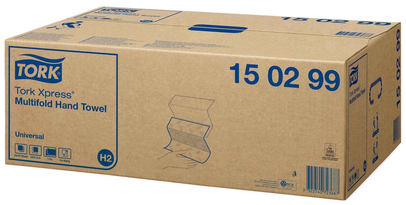 Die TORK Papierhandtücher Xpress® H2 Universal sind die ideale Lösung für hygienische und effiziente Handtrocknung in deinem Betrieb. Mit einem Blattmaß von 23,4 x 21,3 cm bieten diese 2-lagigen Handtücher ausreichend Fläche, um deine Hände gründlich abzutrocknen. Das innovative Interfold-Falzsystem sorgt dafür, dass jedes Handtuch problemlos und hygienisch aus dem Spender entnommen werden kann, was eine einfache Handhabung garantiert. Hergestellt aus hochwertigem Recyclingpapier, vereinen die TORK Papierhandtücher Umweltbewusstsein mit exzellenter Qualität. Sie sind nicht nur eine nachhaltige Wahl, sondern auch besonders sanft zur Haut und bieten eine sehr gute Papierqualität, die den Anforderungen in stark frequentierten Bereichen gerecht wird. Mit einem Karton, der 4.740 Tücher enthält, bist du bestens ausgestattet, um den täglichen Bedarf zu decken. Das H2 - Multifold System ermöglicht eine platzsparende und ordentliche Aufbewahrung der Handtücher, was besonders in kleinen Räumen von Vorteil ist. Der dezente Aufdruck auf den Tüchern verleiht ihnen zudem ein ansprechendes Erscheinungsbild, das in jede Umgebung passt. Die Verwendung von TORK Papierhandtüchern Xpress® H2 Universal bedeutet nicht nur eine Verbesserung der Hygiene in deinem Umfeld, sondern trägt auch zu einem positiven Eindruck bei deinen Gästen und Kunden bei. Entscheide dich für diese praktischen und umweltfreundlichen Handtücher, die Funktionalität und Nachhaltigkeit perfekt vereinen.Technische Daten