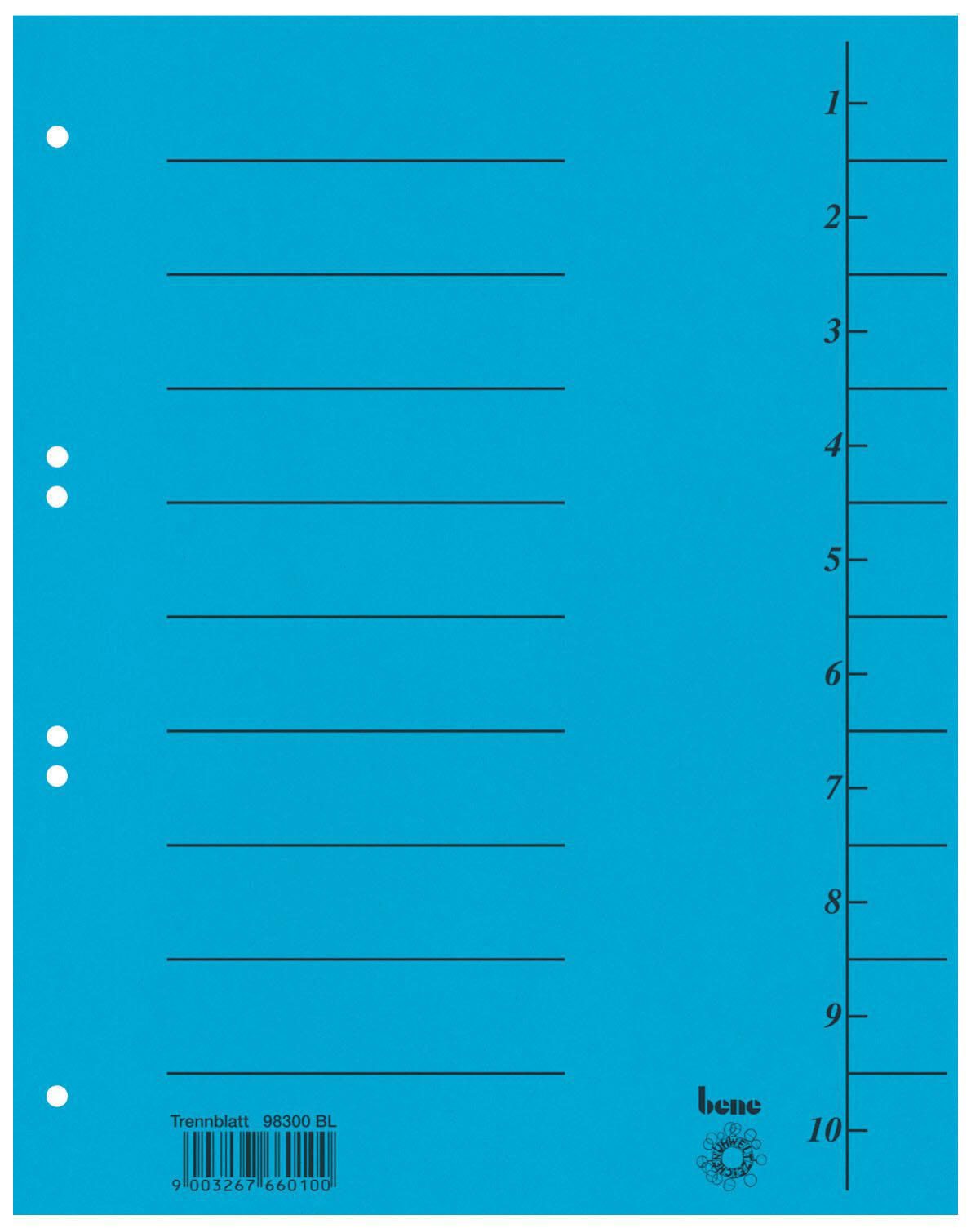 Die bene Trennblätter in DIN A4 Format sind die ideale Lösung für eine übersichtliche und strukturierte Ablage deiner Dokumente. Hergestellt aus hochwertigem Kraftkarton, bieten diese Trennblätter nicht nur eine ansprechende Optik in einem kräftigen Blau, sondern auch eine hohe Stabilität und Langlebigkeit. Mit einem Papiergewicht von 210 g/m² sind sie robust genug, um auch intensiven Einsatz in Büro oder Schule standzuhalten. Die Trennblätter sind mit praktischen Tabs ausgestattet, die von 1 bis 10 nummeriert sind. Diese Tabs sind ausschneidbar, was dir die Möglichkeit gibt, die Trennblätter individuell nach deinen Bedürfnissen zu gestalten. So behältst du immer den Überblick über deine Unterlagen und kannst schnell auf die gewünschten Informationen zugreifen. Die 6-fach-Lochung sorgt dafür, dass die Blätter problemlos in gängige Ordner eingeheftet werden können. Ein weiterer Vorteil ist, dass die bene Trennblätter aus holzfreiem Material gefertigt sind, was sie umweltfreundlich macht. Mit einer Packung von 50 Stück hast du ausreichend Material, um deine Dokumente effizient zu organisieren und zu kategorisieren. Egal, ob für die Schule, das Studium oder im Beruf – diese Trennblätter sind eine wertvolle Unterstützung für deine tägliche Arbeit. Die liniert gestalteten Trennblätter bieten dir zudem die Möglichkeit, wichtige Notizen direkt auf den Tabs zu vermerken, sodass du deine Ablage noch weiter personalisieren kannst. Mit den bene Trennblättern in Blau schaffst du nicht nur Ordnung, sondern auch einen stilvollen Akzent in deinem Büro oder Arbeitsplatz.Technische Daten