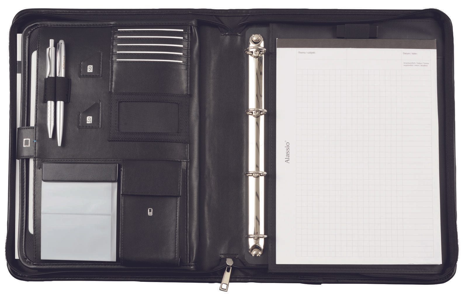 Die Alassio Ringbuchmappe TRENTO in elegantem Schwarz ist die perfekte Lösung für alle, die Ordnung und Stil in ihrem Arbeitsumfeld schätzen. Diese vielseitige Ringbuchmappe bietet nicht nur Platz für deine A4-Dokumente, sondern überzeugt auch durch durchdachte Details und eine ansprechende Optik. Mit den Maßen von 28,5 x 5,0 x 36,0 cm ist sie kompakt genug, um sie mühelos zu transportieren, und bietet dennoch ausreichend Platz für alle wichtigen Unterlagen. Die Ringmechanik mit 4-Rund-Ringen sorgt dafür, dass du deine Dokumente sicher abheften kannst und jederzeit einfach darauf zugreifen kannst. Darüber hinaus ist die Ringmechanik herausnehmbar, was dir Flexibilität beim Organisieren deiner Unterlagen ermöglicht. Ein besonderes Highlight der Alassio Ringbuchmappe TRENTO ist das integrierte Tablet-Fach, das für alle Tablets bis zu einer Größe von 18,0 x 30,0 cm geeignet ist. So kannst du dein Tablet sicher verstauen und hast es immer griffbereit, egal ob für Präsentationen oder Notizen. Die Mappe verfügt außerdem über zwei Stifteschlaufen, die es dir ermöglichen, Schreibutensilien praktisch zu verstauen und immer zur Hand zu haben. Ein Schreibblock ist ebenfalls enthalten, sodass du sofort mit dem Notieren beginnen kannst, ohne zusätzliches Zubehör mitnehmen zu müssen. Hergestellt aus hochwertigem Lederimitat, strahlt die Alassio Ringbuchmappe TRENTO nicht nur Eleganz aus, sondern ist auch besonders pflegeleicht und langlebig. Sie ist ideal für den Einsatz im Büro, bei Meetings oder unterwegs und verleiht deinem Auftritt stets einen professionellen Touch. Entdecke die Vorteile der Alassio Ringbuchmappe TRENTO und bringe Ordnung in deinen Arbeitsalltag.Technische Daten