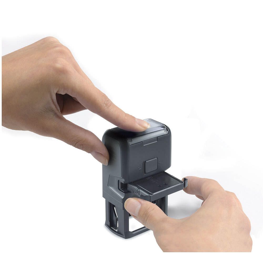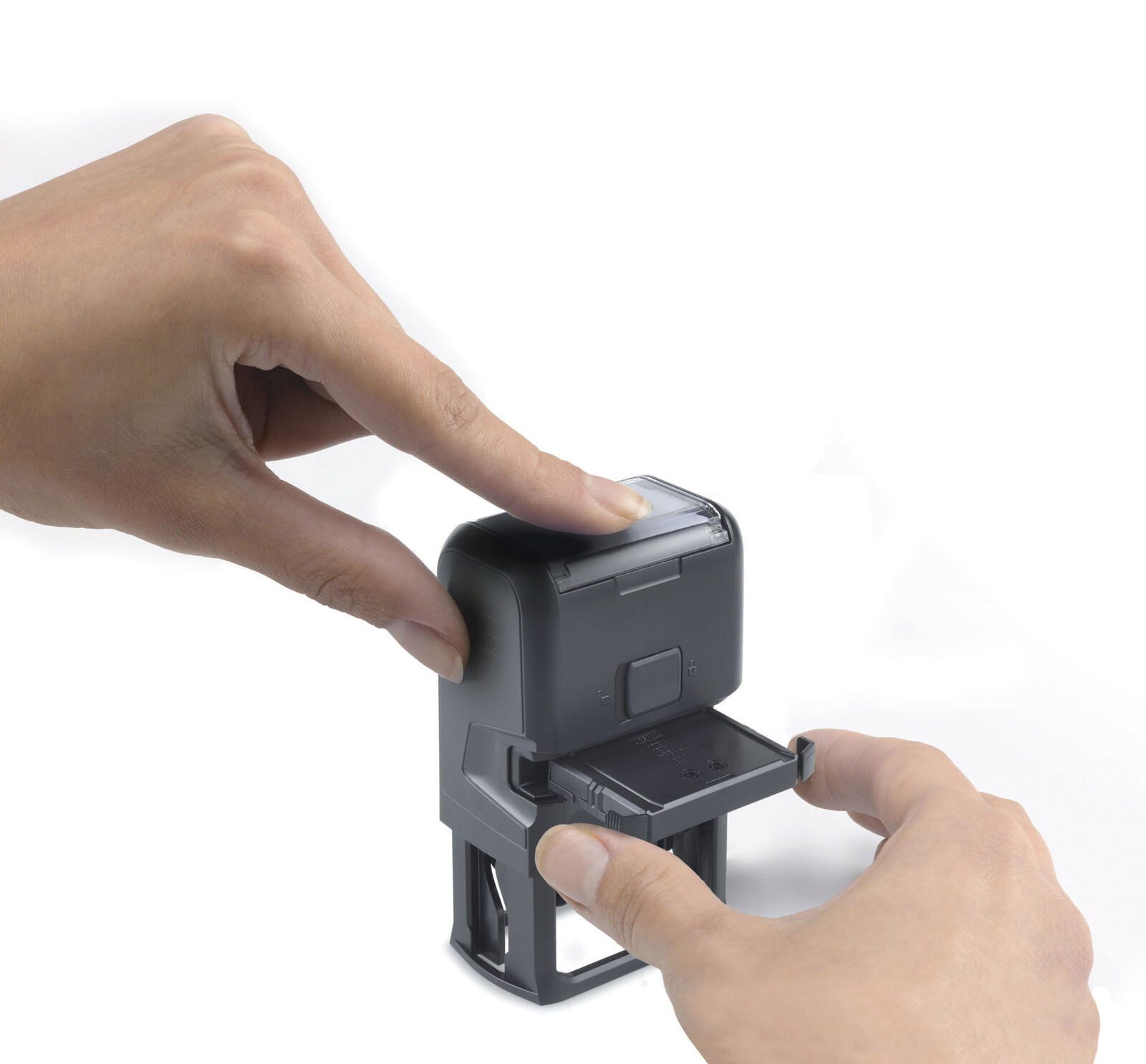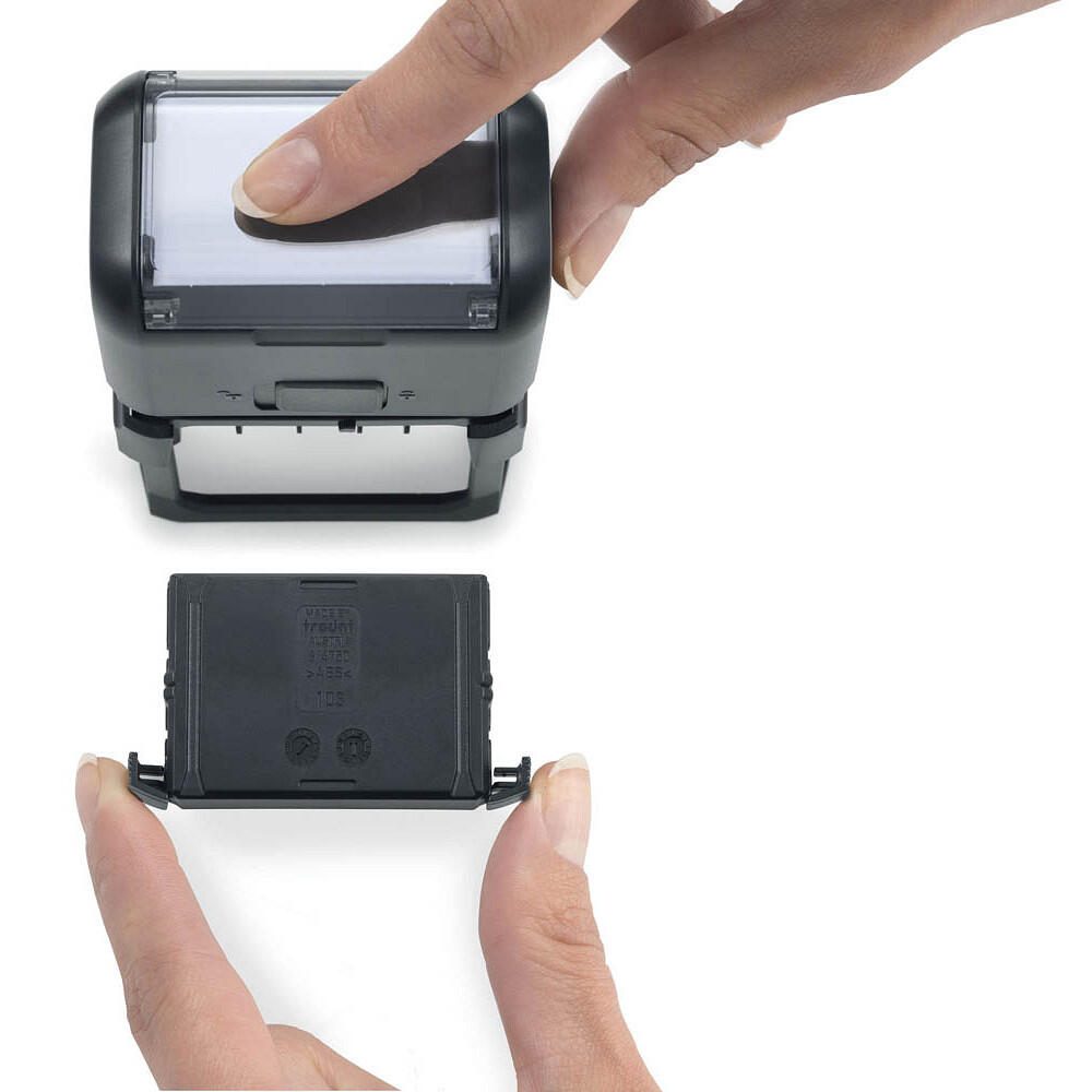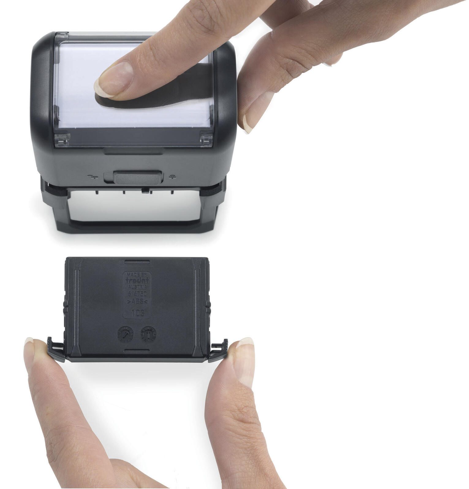 - Selbstfärbender Textstempel mit integriertem und auswechselbarem Stempelkissen
