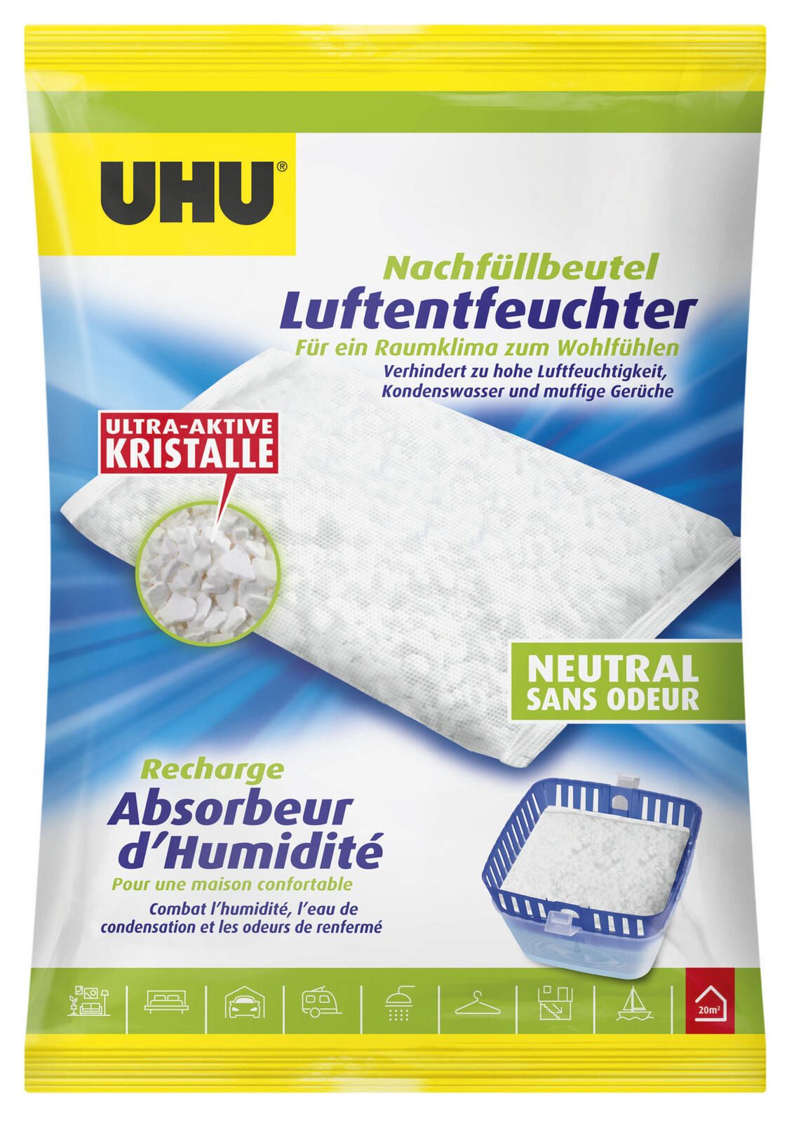 Der UHU Raumentfeuchter Nachfüllpack ist die ideale Lösung, um ein angenehmes Raumklima zu schaffen und die Luftfeuchtigkeit effektiv zu regulieren. Speziell entwickelt für die Verwendung mit dem UHU Luftentfeuchter Original Airmax, bietet dieses Nachfüllpack eine einfache und effektive Möglichkeit, die Funktionsfähigkeit deines Luftentfeuchters aufrechtzuerhalten. Mit einem Inhalt von 450,0 g enthält der Nachfüllpack hochwertiges Granulat, das für seine hervorragenden hygroskopischen Eigenschaften bekannt ist. Dieses Material zieht überschüssige Feuchtigkeit aus der Luft an und sorgt so für ein spürbar trockeneres Raumklima. Dies ist besonders vorteilhaft in feuchten Wohnbereichen, Kellern oder Badezimmern, wo Schimmelbildung und unangenehme Gerüche häufig auftreten können. Die Anwendung des UHU Raumentfeuchters ist denkbar einfach: Du tauschst einfach das leere Granulat im UHU Luftentfeuchter Original Airmax gegen das neue Nachfüllpack aus. So kannst du sicherstellen, dass dein Gerät stets optimal funktioniert und du von den Vorteilen eines trockenen und gesunden Raumklimas profitierst. Darüber hinaus ist das Granulat umweltfreundlich und sicher in der Anwendung, sodass du dir keine Sorgen um gesundheitliche Risiken machen musst. Der UHU Raumentfeuchter Nachfüllpack ist somit nicht nur praktisch, sondern auch eine verantwortungsvolle Wahl für dein Zuhause. Vertraue auf die Qualität von UHU und genieße die Vorzüge eines stets frischen und trockenen Wohnraums.Technische Daten