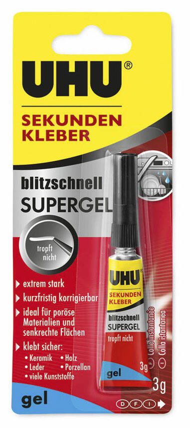 Der UHU Sekundenkleber 3,0 g ist die ideale Lösung für schnelle und zuverlässige Reparaturen im Alltag. Dieser hochwertige Sekundenkleber zeichnet sich durch seine wasserfeste Formel aus, die eine dauerhafte Haftung auch unter feuchten Bedingungen gewährleistet. Egal, ob du kleine Schäden an deinen Lieblingsgegenständen beheben oder kreative Bastelprojekte umsetzen möchtest, dieser Kleber bietet dir die Flexibilität, die du benötigst. Mit einer vielseitigen Anwendbarkeit eignet sich der UHU Sekundenkleber für eine Vielzahl von Materialien. Du kannst ihn problemlos auf Gummi, Holz, Keramik, Kunststoff, Leder, Metall und Porzellan verwenden. Diese breite Materialkompatibilität macht ihn zu einem unverzichtbaren Werkzeug in jedem Haushalt oder Bastelraum. Die 3,0 g Tube ist handlich und ermöglicht eine präzise Dosierung, sodass du immer die richtige Menge an Kleber verwenden kannst, ohne übermäßig zu kleben. Die Anwendung des UHU Sekundenklebers ist kinderleicht. Einfach die zu verklebenden Flächen reinigen, den Kleber auftragen und die Teile kurz zusammendrücken. In Sekundenschnelle hast du eine starke Verbindung geschaffen, die auch hohen Belastungen standhält. Dank seiner schnellen Trocknungszeit kannst du sofort mit deinen Projekten fortfahren, ohne lange Wartezeiten in Kauf nehmen zu müssen. Vertraue auf die Qualität von UHU, einem renommierten Hersteller, der für seine zuverlässigen Klebstoffe bekannt ist. Der UHU Sekundenkleber 3,0 g ist nicht nur praktisch, sondern auch ein Muss für jeden, der Wert auf dauerhafte und starke Verbindungen legt. Ob für Reparaturen, Bastelarbeiten oder kreative Projekte – dieser Sekundenkleber wird dich nicht enttäuschen.Technische Daten