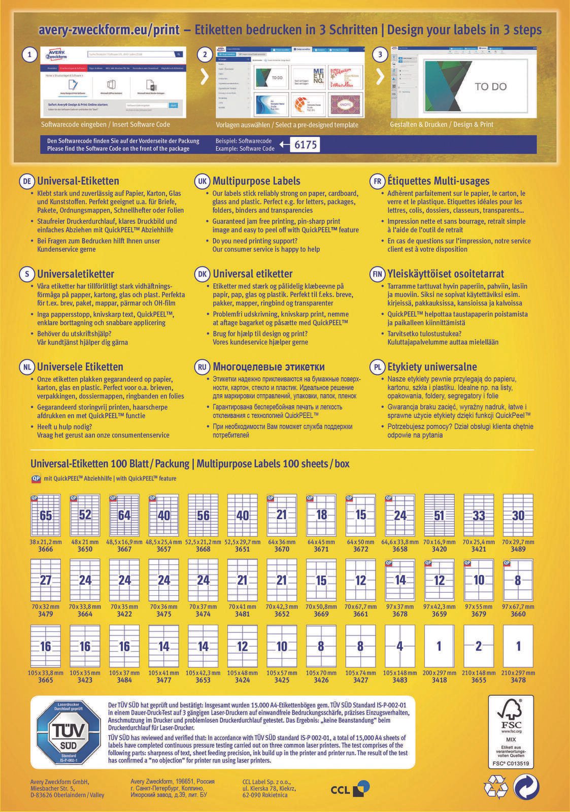 Die AVERY Zweckform Etiketten 3671 in der Größe 64,0 x 45,0 mm sind die ideale Lösung für all deine Beschriftungsbedürfnisse. Mit einer Packung von 1800 Etiketten auf 100 Blatt bieten sie dir eine enorme Menge an vielseitigen Anwendungsmöglichkeiten. Die Etiketten sind aus hochwertigem, holzfreiem Papier gefertigt und zeichnen sich durch ihre matte Oberfläche aus, die eine optimale Druckqualität gewährleistet. Diese rechteckigen Universaletiketten sind selbstklebend und lassen sich mühelos mit verschiedenen Druckern wie Laser-, Inkjet- und Kopiergeräten bedrucken. Dies bedeutet, dass du deine Etiketten ganz nach deinen Wünschen gestalten kannst, sei es für den Einsatz im Büro, zu Hause oder für besondere Anlässe. Die Etiketten sind chlorfrei gebleicht und lösemittelfrei, was sie zu einer umweltfreundlichen Wahl macht. Die AVERY Zweckform Etiketten 3671 sind nicht nur praktisch, sondern auch benutzerfreundlich. Sie sind nicht ablösbar, was bedeutet, dass sie sicher an ihrem Platz bleiben, ohne dass du dir Sorgen über ein versehentliches Ablösen machen musst. Die Anordnung auf einem A4-Bogen ermöglicht eine einfache Handhabung und sorgt dafür, dass du immer die benötigte Anzahl an Etiketten zur Hand hast. Ob für die Beschriftung von Ordnern, Produkten oder Geschenken, diese Etiketten bieten dir die Flexibilität und Qualität, die du benötigst. Dank ihrer blickdichten Eigenschaften sind sie ideal für eine Vielzahl von Anwendungen, bei denen eine klare und professionelle Präsentation gefragt ist. Die AVERY Zweckform Etiketten 3671 sind die perfekte Wahl für jeden, der Wert auf Qualität und Vielseitigkeit legt.Technische Daten