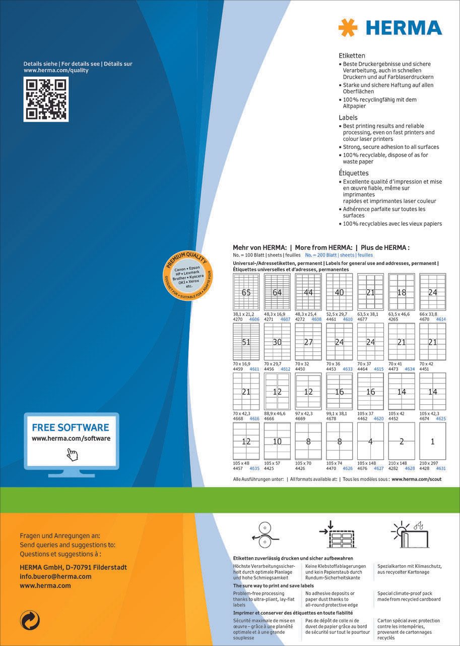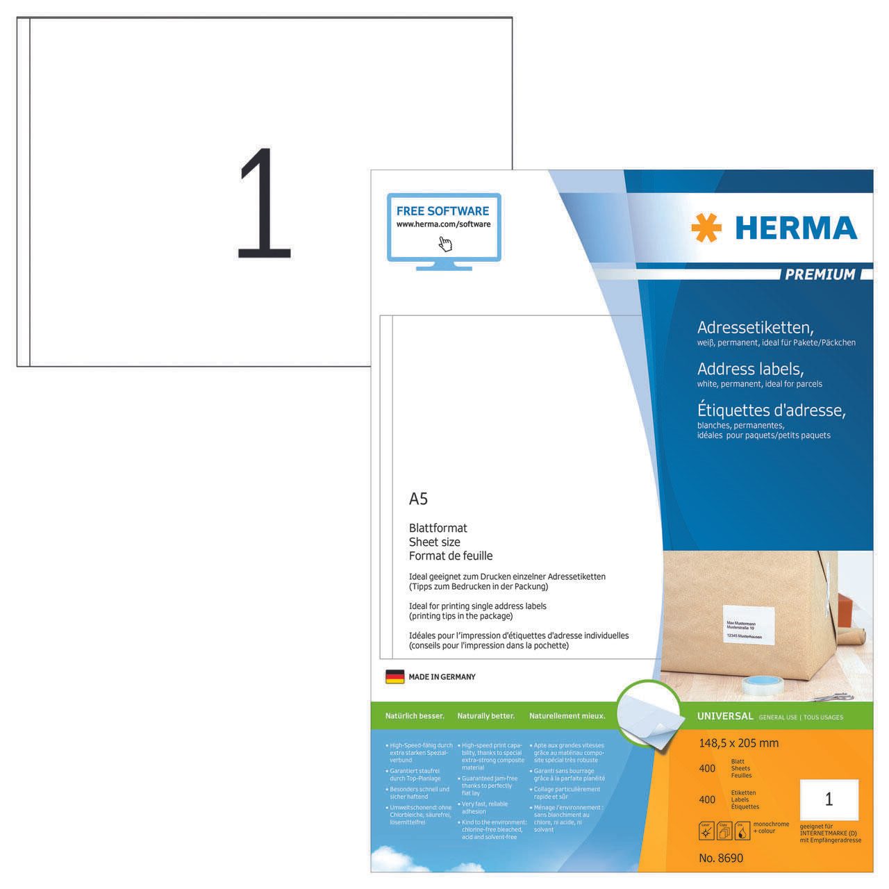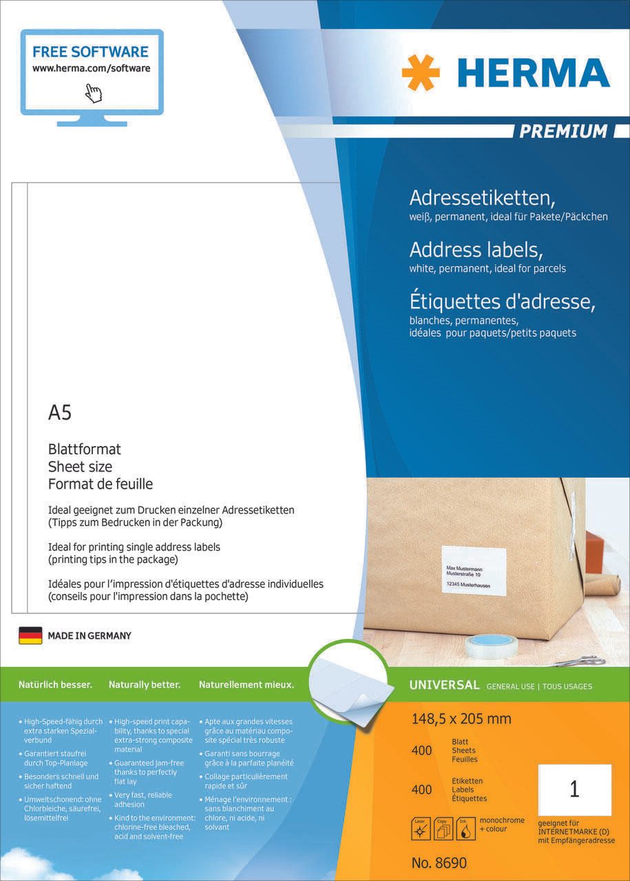 Die HERMA Etiketten 8690 in der Größe 148,5 x 205,0 mm bieten eine ideale Lösung für alle, die hochwertige, selbstklebende Etiketten benötigen. Mit einer Packungsgröße von 400 Etiketten pro Pack sind diese vielseitigen Universaletiketten perfekt für den täglichen Gebrauch im Büro, zu Hause oder in der Schule. Die Etiketten sind aus hochwertigem, chlorfrei gebleichtem Papier gefertigt, was sie umweltfreundlich und nachhaltig macht. Die rechteckige Form und die matte Oberfläche der Etiketten ermöglichen eine klare und präzise Beschriftung, egal ob du einen Inkjet-Drucker, Kopierer oder einen Schwarz-Weiß-Laser verwendest. Die Etiketten sind nicht blickdicht, was bedeutet, dass sie sich ideal für die Kennzeichnung von transparenten oder farbigen Oberflächen eignen. Ihre Größe von 148,5 x 205,0 mm macht sie besonders vielseitig – perfekt für Adressetiketten, Produktetiketten oder organisatorische Zwecke. Ein weiterer Vorteil ist die selbstklebende Eigenschaft, die eine einfache Anwendung ermöglicht. Du kannst die Etiketten mühelos auf eine Vielzahl von Oberflächen anbringen, ohne dass zusätzliche Klebstoffe erforderlich sind. Dank der hochwertigen Verarbeitung sind sie langlebig und halten auch unter verschiedenen Bedingungen gut. Die HERMA Etiketten 8690 sind nicht ablösbar, was sie ideal für dauerhafte Beschriftungen macht. Sie verfügen über abgerundete Ecken, die ein Verknicken und Abblättern an den Kanten verhindern. Zudem sind sie lösemittelfrei, was sie zu einer sicheren Wahl für den Einsatz in Schulen oder Büros macht. Mit den HERMA Etiketten 8690 erhältst du eine zuverlässige und vielseitige Lösung für all deine Beschriftungsbedürfnisse.Technische Daten
