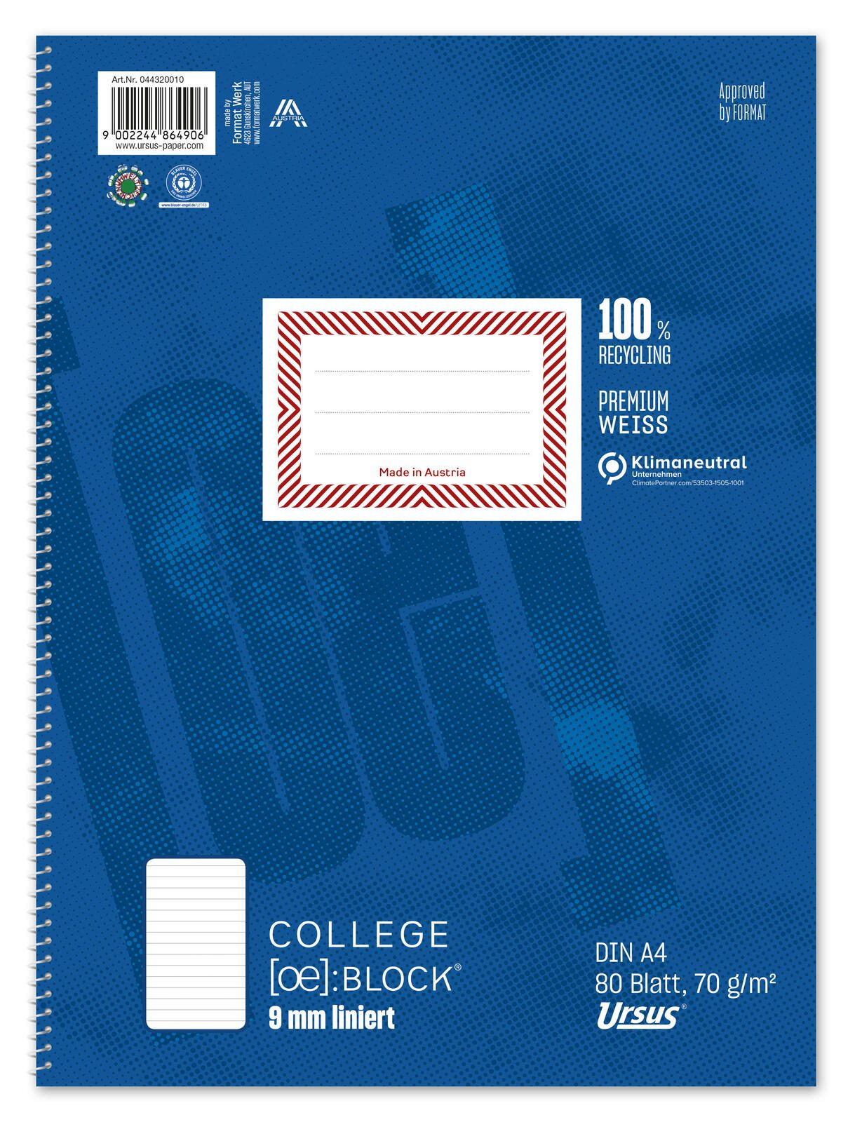 Der Ursus Collegeblock DIN A4 liniert ist der ideale Begleiter für Studierende und Schüler, die Wert auf Qualität und Funktionalität legen. Mit 80 Blatt bietet dieser Collegeblock ausreichend Platz für Notizen, Skizzen und kreative Ideen. Das Papier hat ein Gewicht von 70 g/m², was eine hervorragende Schreibeigenschaft gewährleistet und gleichzeitig dafür sorgt, dass deine Aufzeichnungen klar und deutlich bleiben. Ein besonderes Merkmal des Ursus Collegeblocks ist der Innenrand, der dir ermöglicht, deine Notizen ordentlich zu strukturieren. Die linierte Ausführung sorgt dafür, dass deine Schrift immer gerade bleibt und du auch bei längeren Texten den Überblick behältst. Das DIN A4 Format ist perfekt für alle, die viel Platz zum Schreiben benötigen. Ein weiterer Vorteil ist die flexible Bindung, die dir erlaubt, die Seiten mühelos umzublättern, ohne dass sie beschädigt werden. Der Collegeblock ist aus hochwertigem, weißem Recycling-Papier gefertigt, das nicht nur umweltfreundlich ist, sondern auch holzfrei und elementar chlorfrei gebleicht (ECF). Damit trägst du aktiv zum Umweltschutz bei, während du gleichzeitig auf ein Produkt setzt, das höchsten Ansprüchen genügt. Die 4-fach-Lochung ermöglicht es dir, den Collegeblock problemlos in Ordnern oder Mappen abzulegen, was die Organisation deiner Unterlagen erheblich erleichtert. Mit der praktischen Microperforation kannst du Seiten bei Bedarf sauber und einfach abtrennen. Der Ursus Collegeblock DIN A4 liniert vereint Funktionalität, Qualität und Umweltbewusstsein in einem Produkt. Ob in der Schule, an der Uni oder für persönliche Projekte – dieser Collegeblock ist die perfekte Wahl für alle, die gerne schreiben und organisieren.Technische Daten