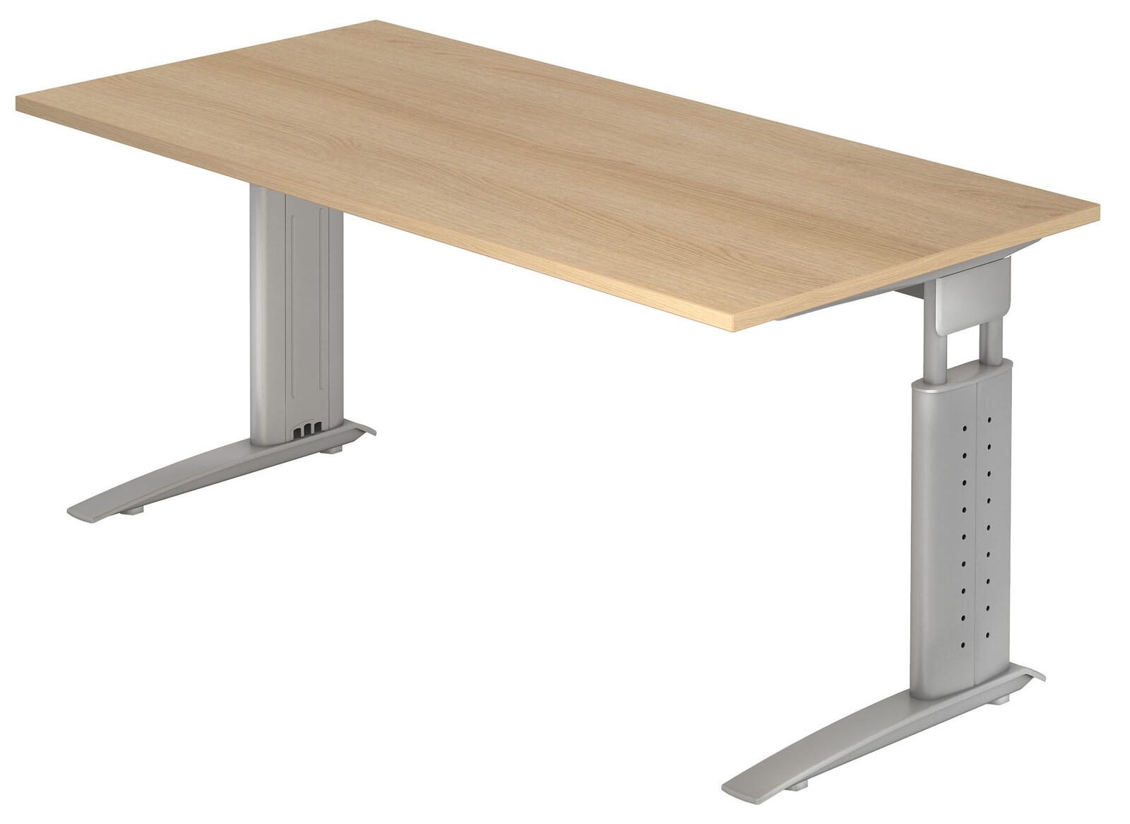 Der HAMMERBACHER höhenverstellbare Schreibtisch VUS16/E/S in edlem Eichenholz-Design vereint Funktionalität und Ästhetik auf perfekte Weise. Die Tischplatte besteht aus hochwertiger Spanplatte, die für ihre Stabilität und Langlebigkeit bekannt ist. Das stilvolle C-Fuß-Gestell aus robustem Stahl in Silber sorgt für eine sichere Standfestigkeit und verleiht dem Schreibtisch ein modernes Erscheinungsbild. Mit den Maßen von 160 cm in der Breite, 80 cm in der Tiefe und einer Höhe von 68 cm bietet der Schreibtisch ausreichend Platz für Ihre Arbeitsmaterialien und persönlichen Gegenstände. Die intuitive Höhenverstellbarkeit ermöglicht es Ihnen, die Tischhöhe individuell anzupassen, um sowohl im Sitzen als auch im Stehen bequem arbeiten zu können. Dies fördert nicht nur die Ergonomie, sondern trägt auch zu einer gesunden Körperhaltung während des Arbeitstags bei. Die ansprechende Eichenfarbe des Schreibtisches fügt sich harmonisch in jedes Büro- oder Arbeitsumfeld ein und sorgt für eine angenehme Atmosphäre. Der HAMMERBACHER Schreibtisch ist ideal für alle, die Wert auf eine stilvolle und funktionale Einrichtung legen. Zudem bietet er genügend Platz für Computer, Bücher und Zubehör, ohne dass es zu einer Überfüllung kommt. Ob im Homeoffice, im Büro oder in einem kreativen Raum – der HAMMERBACHER höhenverstellbare Schreibtisch VUS16/E/S ist die perfekte Wahl für alle, die eine flexible und anpassbare Arbeitsfläche suchen. Genießen Sie die Vorteile eines ergonomischen Arbeitsplatzes und steigern Sie Ihre Produktivität mit diesem durchdachten Möbelstück.Technische Daten