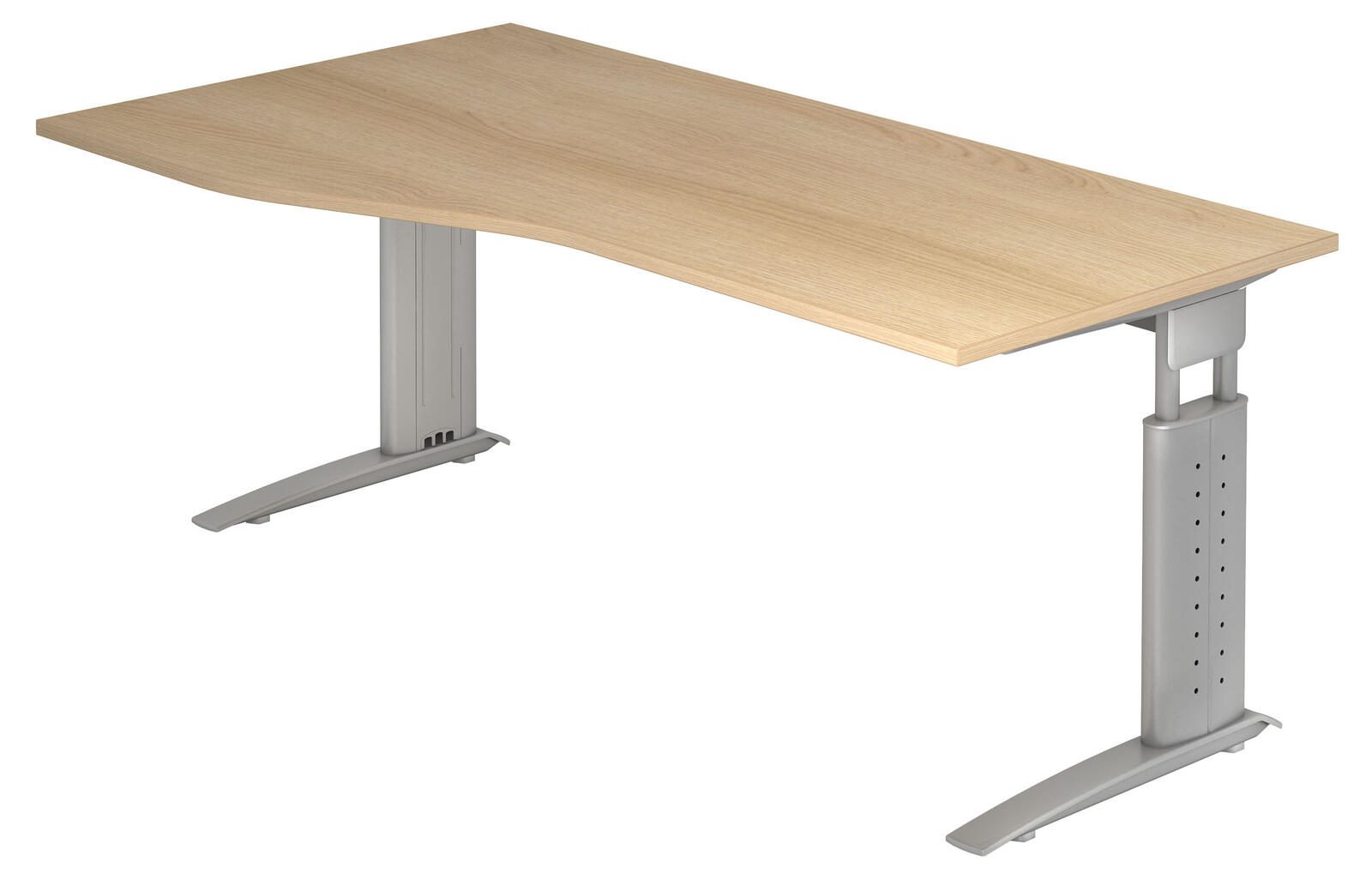 Der HAMMERBACHER VUS18/E/S höhenverstellbare Schreibtisch vereint Funktionalität und modernes Design in einem eleganten Möbelstück. Mit einer Tischhöhe von 68 bis 86 cm lässt sich dieser Schreibtisch individuell an Ihre Bedürfnisse anpassen, sodass Sie sowohl im Sitzen als auch im Stehen komfortabel arbeiten können. Die Tischplatte aus robuster Spanplatte in Eiche-Optik verleiht dem Schreibtisch eine natürliche und ansprechende Ästhetik, während das silberne Stahlgestell nicht nur stabil, sondern auch stilvoll ist. Die trapezförmige Ausführung des Gestells sorgt für eine optimale Beinfreiheit und ermöglicht es Ihnen, den Schreibtisch flexibel in verschiedenen Arbeitsumgebungen zu integrieren. Das C-Fuß-Gestell bietet zusätzliche Stabilität und unterstützt die Höhenverstellung, sodass Sie mühelos zwischen verschiedenen Arbeitshöhen wechseln können. Dies fördert nicht nur eine gesunde Körperhaltung, sondern kann auch die Produktivität steigern. Ein weiterer Vorteil des HAMMERBACHER VUS18/E/S ist die einfache Handhabung. Durch die intuitive Höhenverstellung können Sie schnell und unkompliziert die ideale Position für Ihre Arbeit finden. Ob im Home Office oder im klassischen Büro, dieser Schreibtisch passt sich Ihren Anforderungen an und unterstützt Sie dabei, effizient zu arbeiten. Die Kombination aus hochwertigem Material und durchdachtem Design macht den HAMMERBACHER VUS18/E/S zu einer ausgezeichneten Wahl für alle, die Wert auf Ergonomie und Stil legen. Verleihen Sie Ihrem Arbeitsplatz mit diesem höhenverstellbaren Schreibtisch einen modernen Touch und profitieren Sie von den vielseitigen Einsatzmöglichkeiten, die er bietet.Technische Daten