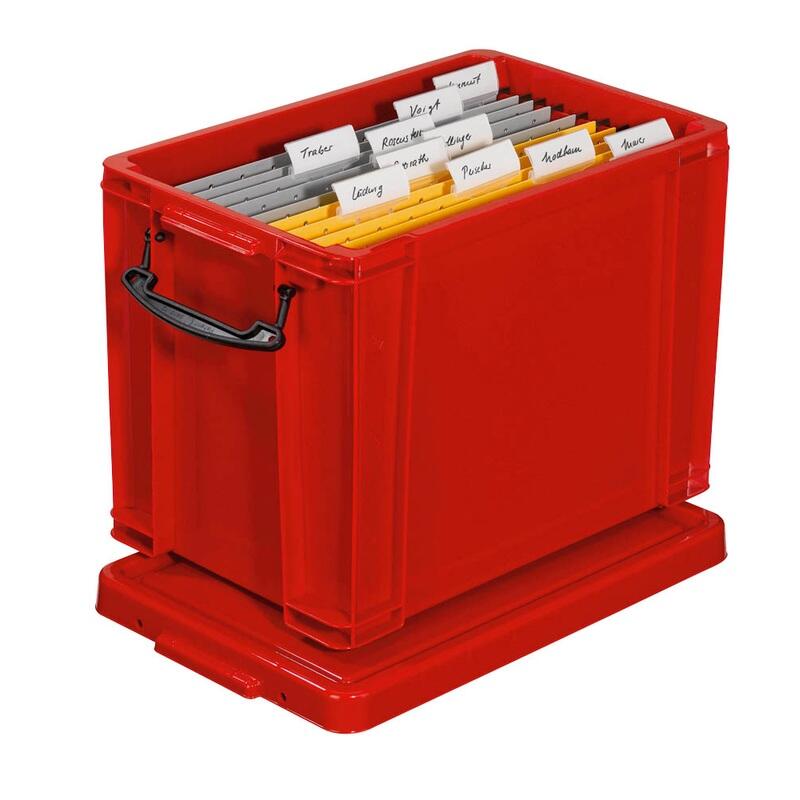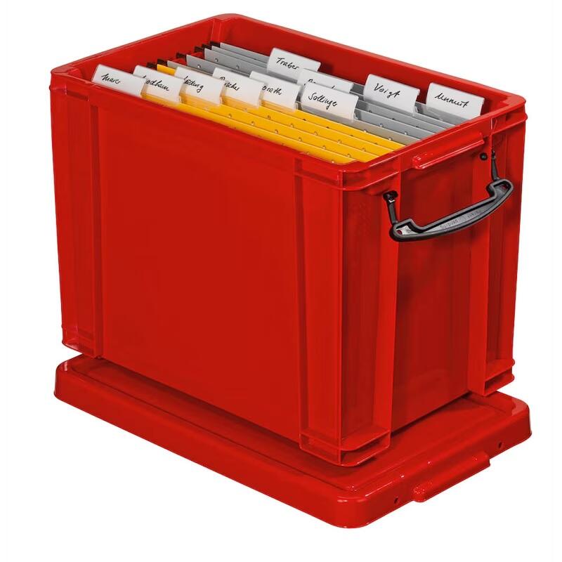 Die Really Useful Box Aufbewahrungsbox in einem ansprechenden Rot bietet eine praktische Lösung für alle, die Ordnung und Übersichtlichkeit in ihrem Zuhause oder Büro schätzen. Mit einem großzügigen Fassungsvermögen von 19,0 Litern und den Außenmaßen von 39,5 x 25,5 x 29,0 cm ist diese Box ideal geeignet für die Aufbewahrung von Hängemappen und anderen wichtigen Dokumenten. Hergestellt aus hochwertigem Polypropylen, überzeugt die Aufbewahrungsbox durch ihre Langlebigkeit und Stabilität. Der robuste Deckel sorgt dafür, dass der Inhalt sicher verstaut ist und vor Staub und Schmutz geschützt bleibt. Die Box ist stapelbar, was dir ermöglicht, den verfügbaren Platz optimal zu nutzen und gleichzeitig einen aufgeräumten Look zu bewahren. Die auffällige rote Farbe verleiht jedem Raum einen frischen Akzent und macht die Box nicht nur funktional, sondern auch zu einem dekorativen Element. Obwohl sie nicht lebensmittelecht ist, eignet sich die Really Useful Box hervorragend für die Aufbewahrung von Büromaterialien, Bastelutensilien oder sogar Spielzeug. Mit dieser Aufbewahrungsbox hast du eine praktische und stilvolle Möglichkeit, um Ordnung zu halten und gleichzeitig einen Hauch von Farbe in deinen Alltag zu bringen. Die durchdachte Konstruktion und das ansprechende Design machen die Really Useful Box zu einem unverzichtbaren Helfer in jedem Haushalt oder Büro.Technische Daten