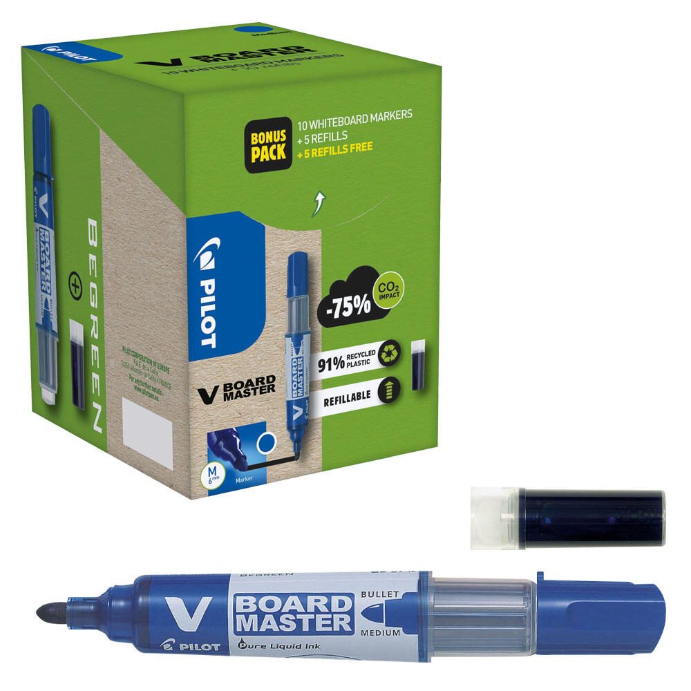 Der PILOT V Board Master Whiteboard-Marker ist die perfekte Wahl für alle, die ihre Ideen und Gedanken klar und präzise auf Whiteboards festhalten möchten. Mit einer Strichstärke von 2.0 bis 5.0 mm bietet dieser Marker eine vielseitige Anwendung, egal ob für Präsentationen, Brainstorming-Sessions oder im Unterricht. Die Rundspitze sorgt für ein angenehmes Schreibgefühl und ermöglicht sowohl feine Linien als auch kräftige Striche, was dir hilft, deine Botschaften klar zu kommunizieren. Ein herausragendes Merkmal des V Board Master ist seine abwischbare und geruchsarme Tinte. Du kannst deine Notizen mühelos entfernen, ohne Rückstände zu hinterlassen, was die Nutzung des Whiteboards einfach und effizient macht. Die blaue Schreibfarbe hebt sich deutlich vom Whiteboard ab und sorgt dafür, dass deine Inhalte immer gut lesbar sind. Darüber hinaus ist der Marker nachfüllbar, was nicht nur umweltfreundlich ist, sondern auch deine Kosten langfristig senkt. Die Qualität von PILOT ist in jedem Detail spürbar. Der Marker ist speziell für die Verwendung auf Whiteboards konzipiert und bietet eine gleichmäßige Tintenabgabe, die ein flüssiges Schreiben ermöglicht. Mit seinem runden Griff liegt der Marker angenehm in der Hand und ermöglicht ein ermüdungsfreies Schreiben, selbst über längere Zeiträume hinweg. Der V Board Master ist nicht nur funktional, sondern auch ein stilvolles Schreibwerkzeug, das in jedem Büro, Klassenzimmer oder Meetingraum eine gute Figur macht. Die Kombination aus hochwertiger Verarbeitung und durchdachtem Design macht diesen Whiteboard-Marker zu einem unverzichtbaren Begleiter für alle, die Wert auf Qualität und Benutzerfreundlichkeit legen.Technische Daten