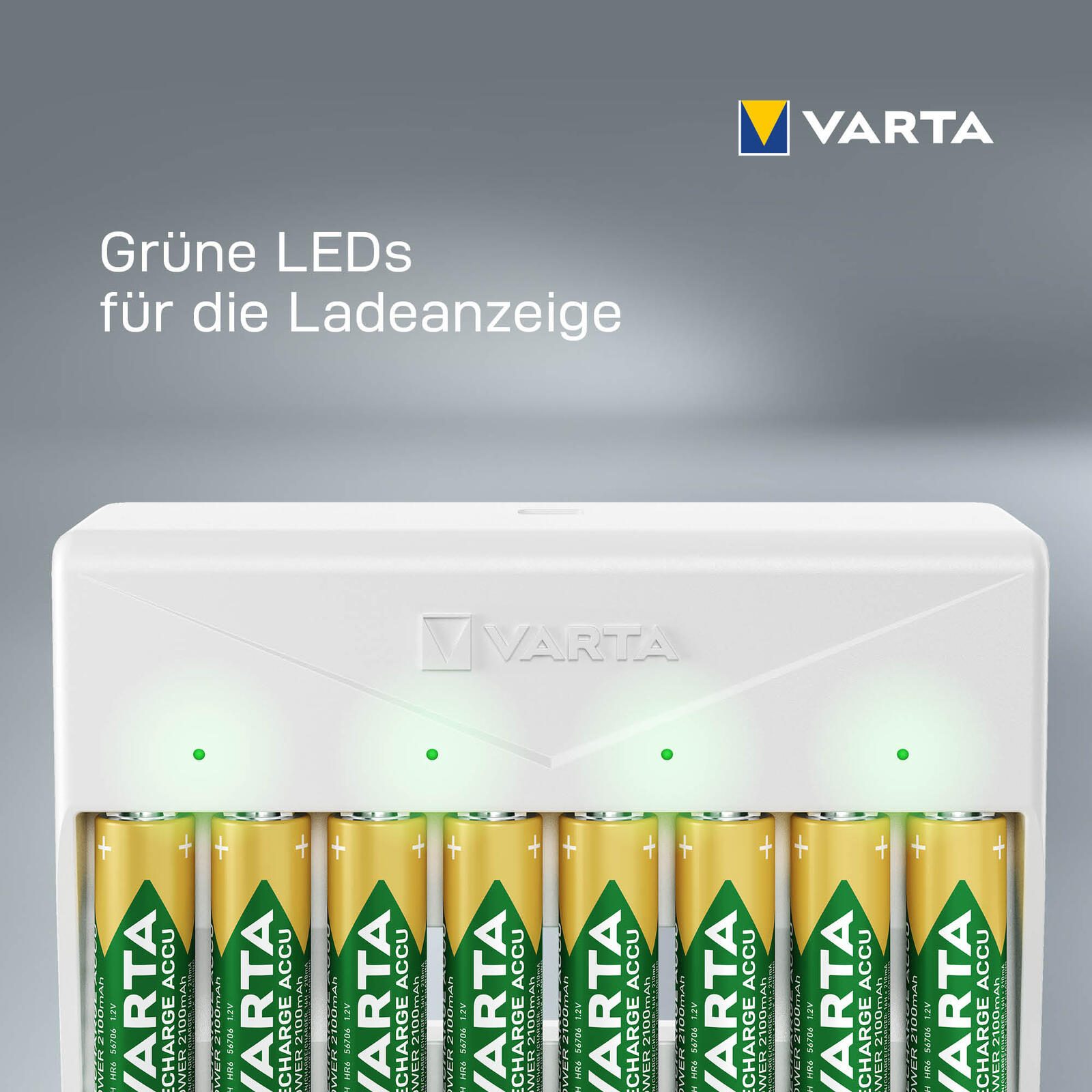 - Kompaktes und handliches Ladegerät in moderner weißer Farbe mit grünen LEDs zur Ladeanzeige. Einzigartige VARTA-Markenelemente sorgen für einen außergewöhnlichen Produktlook