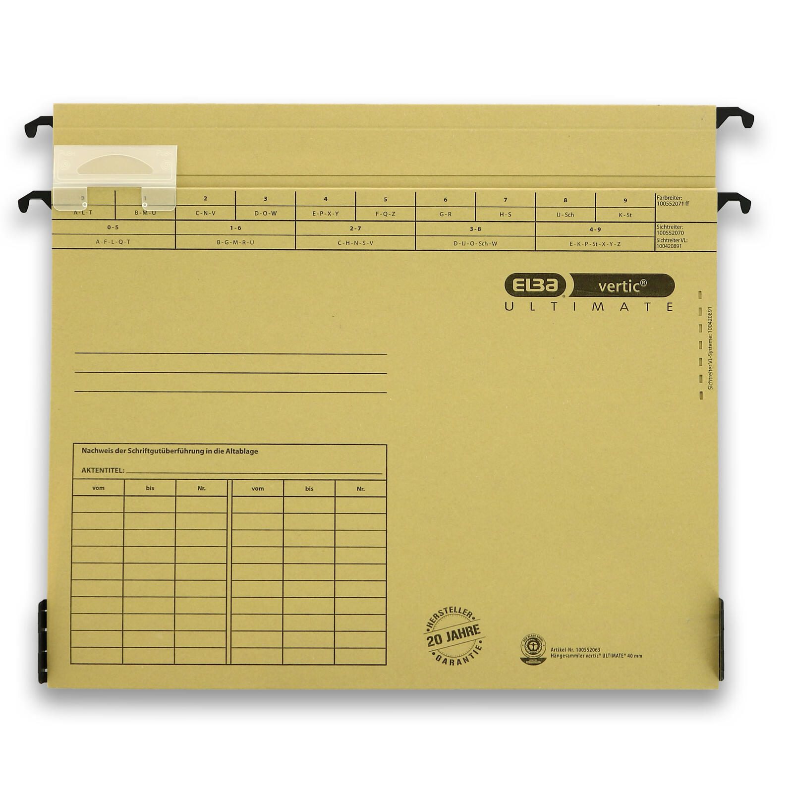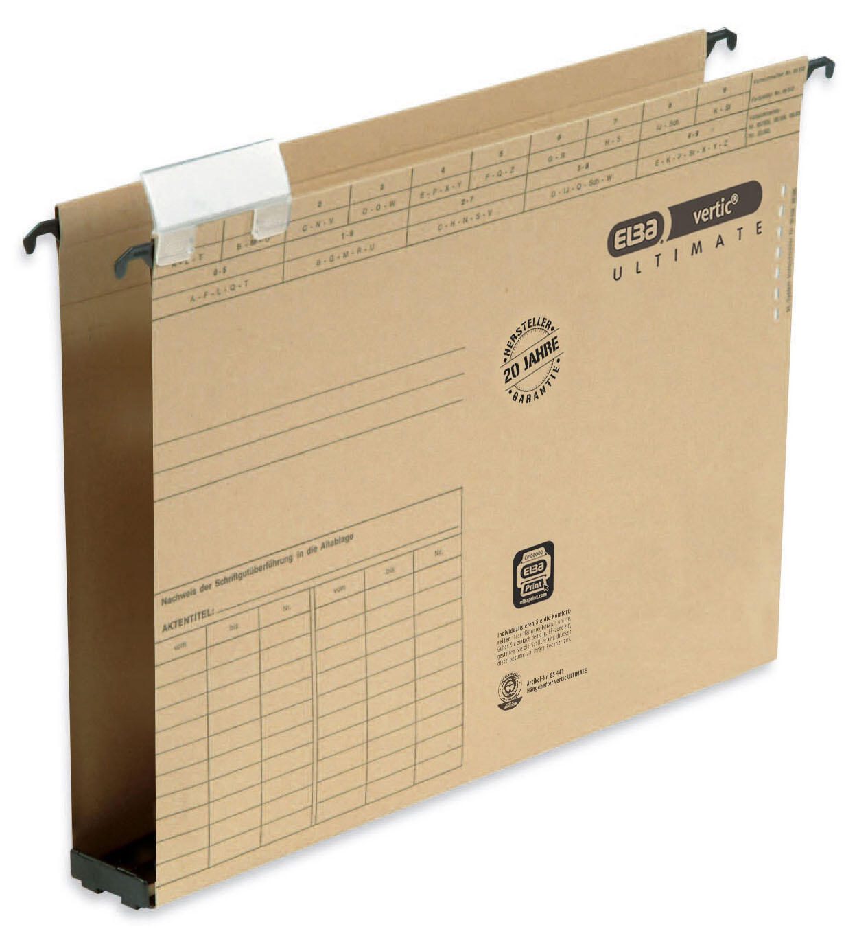Der ELBA vertic ULTIMATE Hängesammler in naturbraun ist die ideale Lösung für die übersichtliche und stilvolle Ablage deiner Dokumente im DIN A4 Format. Mit einem Papiergewicht von 320 g/m² bietet dieser Hängesammler nicht nur eine hohe Stabilität, sondern auch eine ansprechende Optik, die in jedes Büro oder Homeoffice passt. Hergestellt aus hochwertigem Karton, vereint der Hängesammler Funktionalität und Ästhetik. Die seitlich offene Konstruktion ermöglicht einen schnellen Zugriff auf die aufbewahrten Unterlagen, während die Breite des Bodens von 4 cm ausreichend Platz für mehrere Dokumente bietet. Ob für die lose Ablage von wichtigen Papieren, Berichten oder Präsentationen, dieser Hängesammler sorgt dafür, dass alles geordnet und griffbereit bleibt. Mit einer praktischen Packungsgröße von 25 Stück ist der ELBA vertic ULTIMATE Hängesammler nicht nur ideal für den persönlichen Gebrauch, sondern auch perfekt für Büros mit hohem Dokumentationsbedarf. Die naturbraune Farbe verleiht deinem Arbeitsplatz eine warme und einladende Atmosphäre und harmoniert hervorragend mit anderen Büroaccessoires. Entscheide dich für den ELBA vertic ULTIMATE Hängesammler und erlebe die Vorteile einer durchdachten Ablage, die sowohl funktional als auch optisch überzeugt.Technische Daten