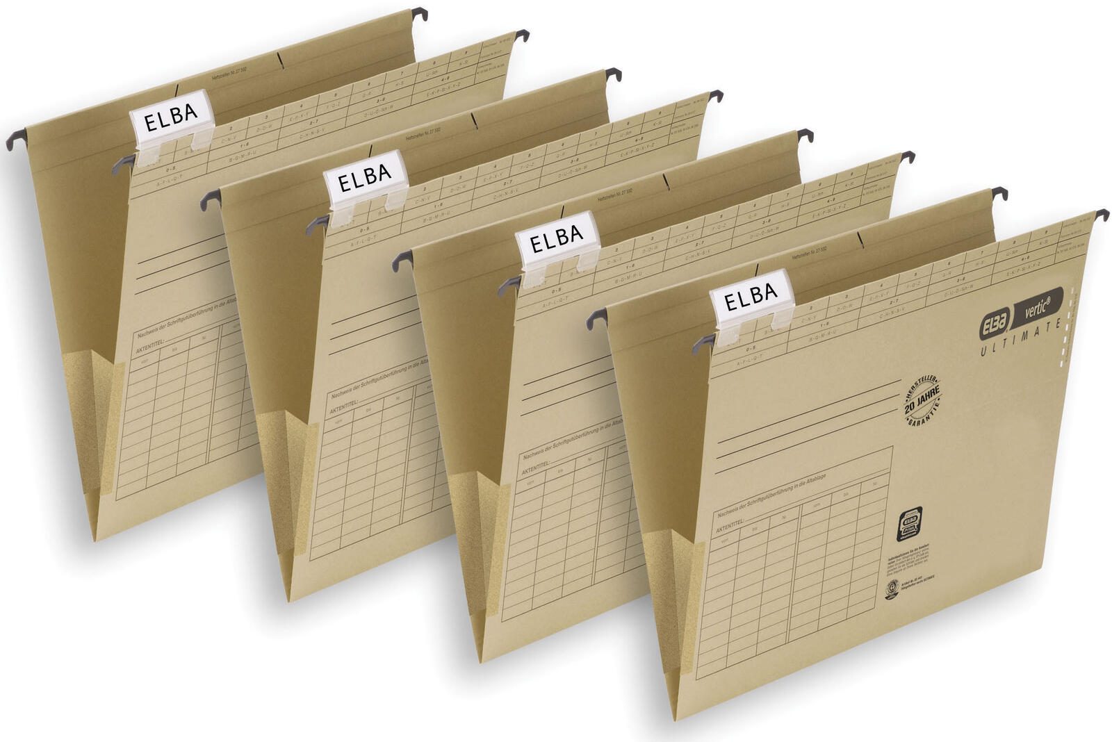 Die ELBA Hängetaschen Vertic Ultimate in naturbraun bieten eine praktische und stilvolle Lösung für die Aufbewahrung und Organisation deiner Dokumente im DIN A4 Format. Hergestellt aus extrastarkem Karton mit einem Papiergewicht von 240 g/m², garantieren diese Hängetaschen nicht nur Langlebigkeit, sondern auch eine ansprechende Optik, die in jedem Büro oder Arbeitsumfeld gut aussieht. Mit einem Pack von 25 Stück bist du bestens ausgestattet, um deine Unterlagen sicher und übersichtlich zu lagern. Die naturbraune Farbe verleiht den Hängetaschen ein elegantes und zeitloses Design, das sich harmonisch in jede Umgebung einfügt. Die Hängetaschen sind ideal für die lose Ablage von Dokumenten geeignet und helfen dir, Ordnung zu halten, ohne Kompromisse bei der Qualität einzugehen. Ein herausragendes Merkmal der ELBA Hängetaschen ist die Lieferung inklusive verschieb- und einrastbaren Vollsichtreitern sowie den praktischen Beschriftungsschildchen. Diese Funktionalität ermöglicht es dir, deine Unterlagen schnell und einfach zu kategorisieren und zu kennzeichnen, sodass du jederzeit den Überblick behältst. Die ELBA Hängetaschen Vertic Ultimate sind die perfekte Wahl für alle, die Wert auf eine professionelle und geordnete Dokumentenablage legen. Ihre robuste Bauweise und die durchdachten Details machen sie zu einem unverzichtbaren Utensil für jedes Büro. Vertraue auf die Qualität von ELBA und erlebe die Vorteile dieser durchdachten Hängetaschen in deinem Arbeitsalltag.Technische Daten