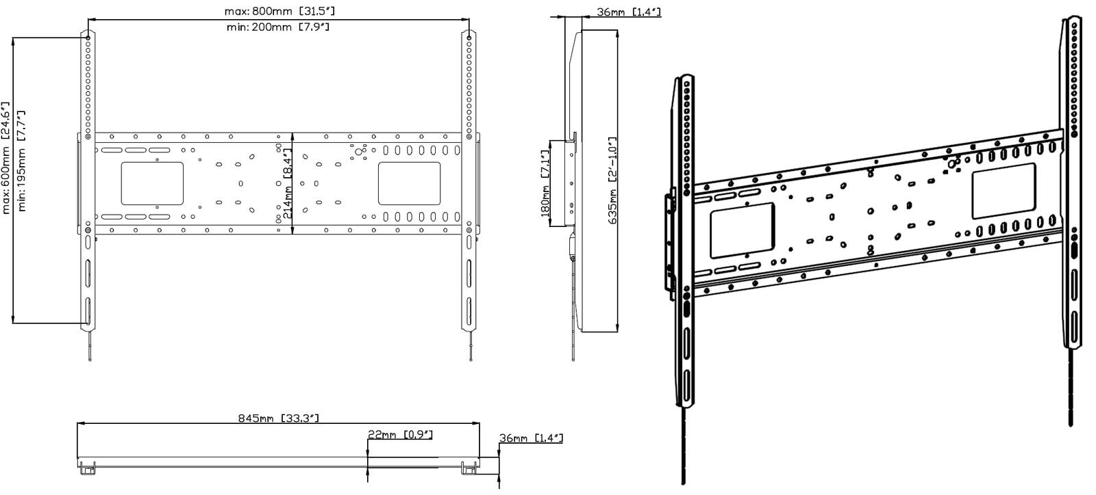 Mit dem flachen Design lässt sich der Bildschirm nur 36 mm / 1,4" von der Wand entfernt befestigen. Das sieht besser aus, vermeidet das Hängenbleiben und bietet eine höhere zulässige Belastung, da sich die Last nahe an der Wand befindet.