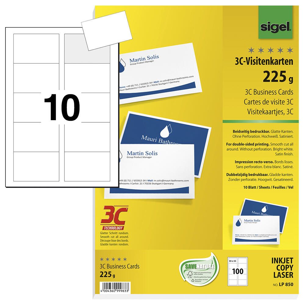 Die SIGEL Visitenkarten aus hochwertigem Edelkarton bieten dir die ideale Grundlage, um einen bleibenden Eindruck bei deinen Geschäftspartnern und Kunden zu hinterlassen. Mit einem Papiergewicht von 225 g/m² sind diese Karten nicht nur stabil, sondern vermitteln auch Professionalität und Wertigkeit. Die satinierte Oberfläche in hochweiß sorgt dafür, dass deine Druckergebnisse besonders lebendig und klar zur Geltung kommen. Du kannst die Visitenkarten problemlos mit einem Laser- oder Inkjetdrucker sowie einem Kopierer bedrucken. Dies ermöglicht dir eine hohe Flexibilität bei der Gestaltung und Personalisierung deiner Karten. Egal, ob du ein schlichtes Design oder ein kreatives Layout bevorzugst, die Möglichkeiten sind nahezu unbegrenzt. Die Karten sind auf einem A4-Bogen angeordnet, was die Handhabung und den Druckprozess erleichtert. Mit einer Breite von 85 mm und einer Höhe von 55 mm haben die Visitenkarten die gängigen Maße, die sich ideal in Brieftaschen oder Visitenkartenhaltern verstauen lassen. Die Karten sind zudem holzfrei, was ihre Umweltfreundlichkeit unterstreicht. In einer Packung erhältst du 100 Stück, sodass du ausreichend Material zur Verfügung hast, um dein Netzwerk zu erweitern und deine Kontakte zu pflegen. Die SIGEL Visitenkarten sind die perfekte Wahl für alle, die Wert auf Qualität und ansprechendes Design legen. Lass deine Kreativität freien Lauf und präsentiere dich und dein Unternehmen mit diesen eleganten und professionellen Visitenkarten.Technische Daten