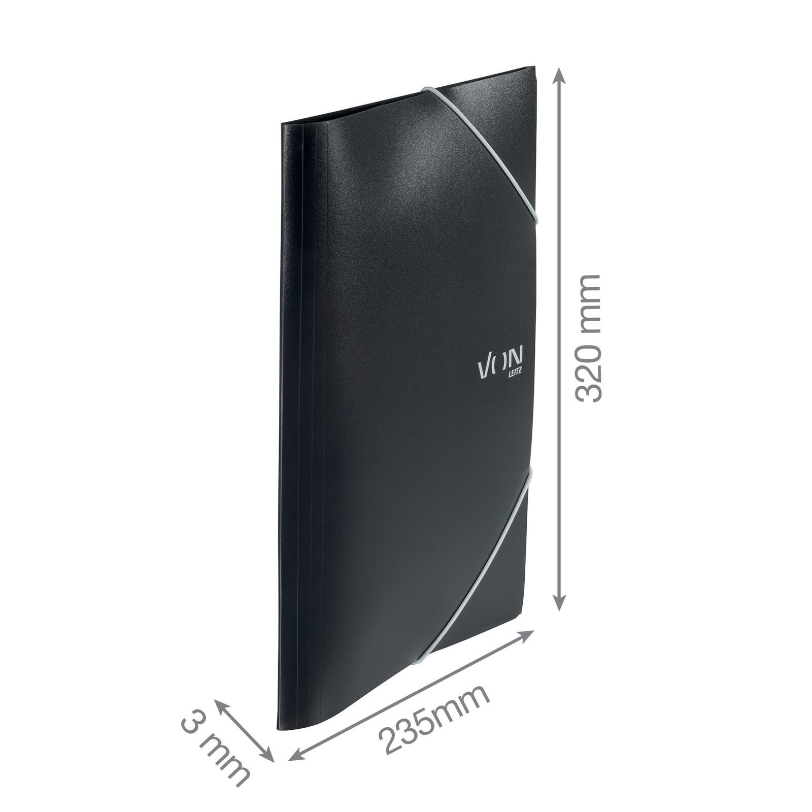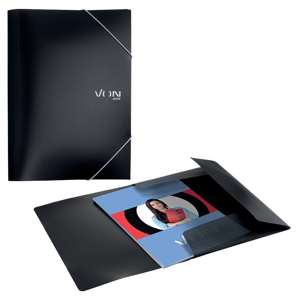 Die VON LEITZ Sammelmappe ist speziell für Dokumente im Format DIN A4 konzipiert. Sie bietet eine praktische Lösung zur übersichtlichen Ablage und Aufbewahrung von Papieren und Zeichnungen. Die Mappe ist in einem schlichten Schwarz gehalten, was ihr ein professionelles und zeitloses Erscheinungsbild verleiht.