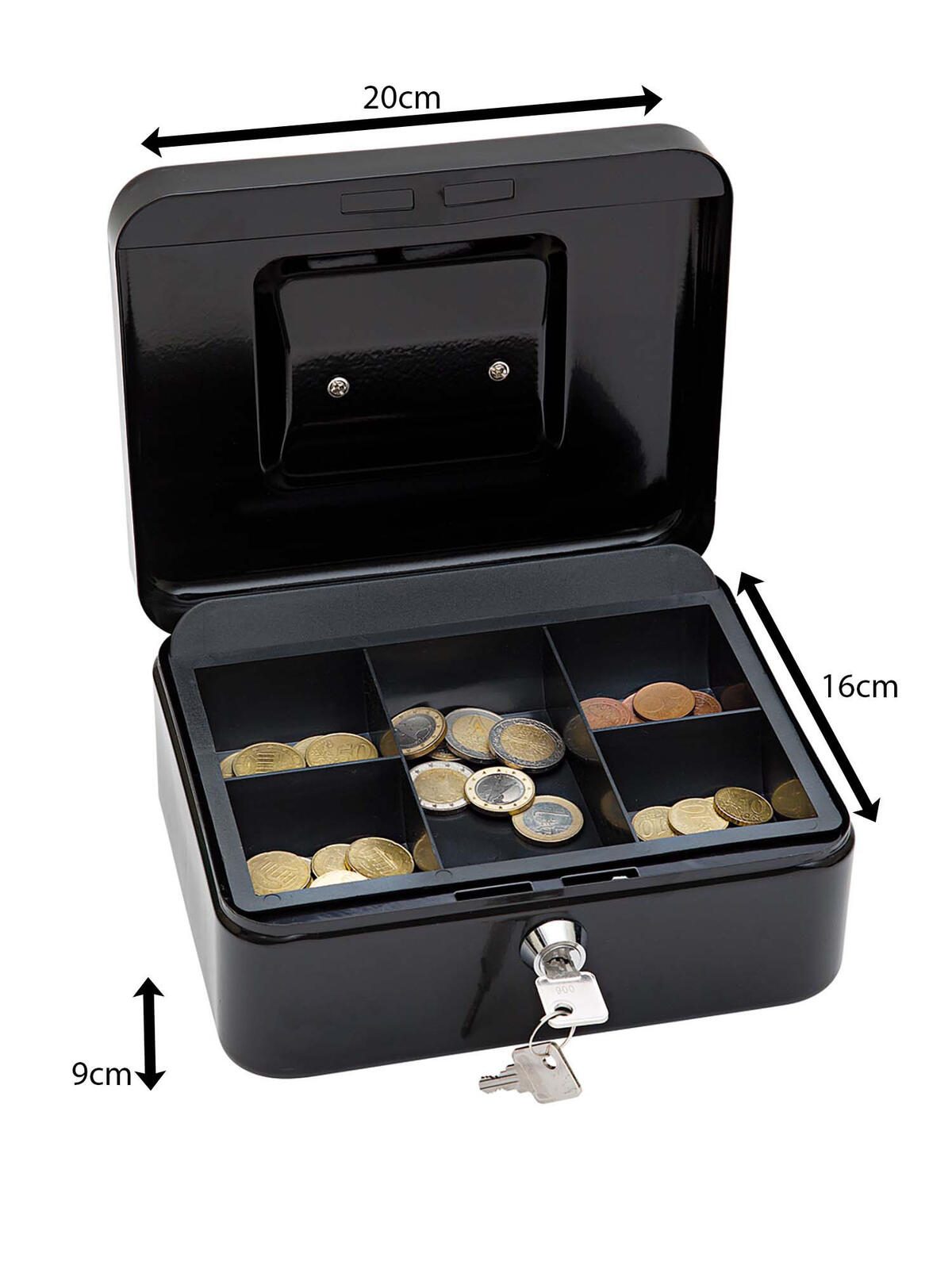 Die Maße von 20,0 x 16,0 x 9,0 cm machen diese Geldkassette handlich und platzsparend. Ihr zeitloses Design in schwarz verleiht ihr einen eleganten Look, der zu jedem Wohnambiente passt.