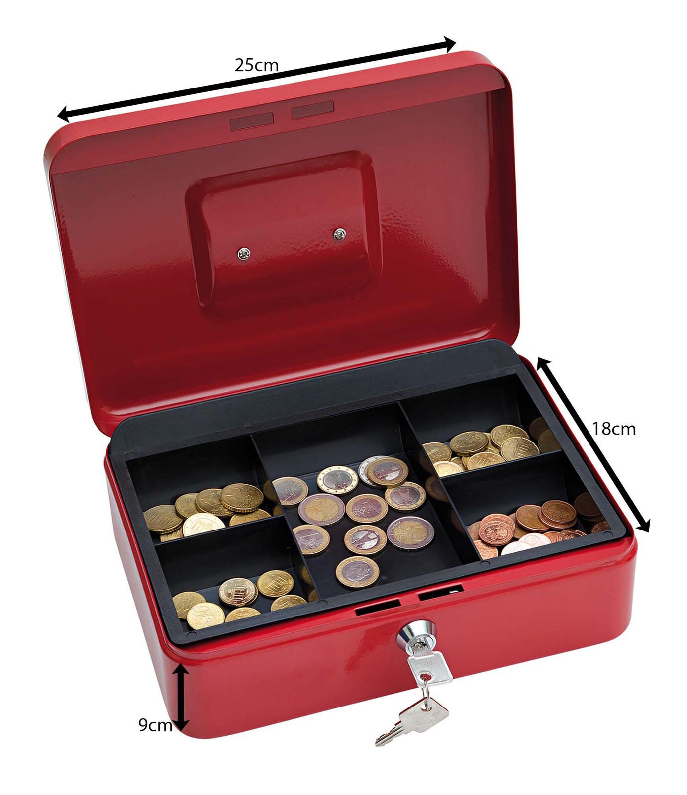 Die WEDO Geldkassette 145302X in Größe 3 präsentiert sich in einem auffälligen roten Farbton, der sie leicht erkennbar macht. Durch ihre praktische Größe von 25,0 x 18,0 x 9,0 cm ist sie handlich und bietet dennoch ausreichend Platz für deine Wertsachen.