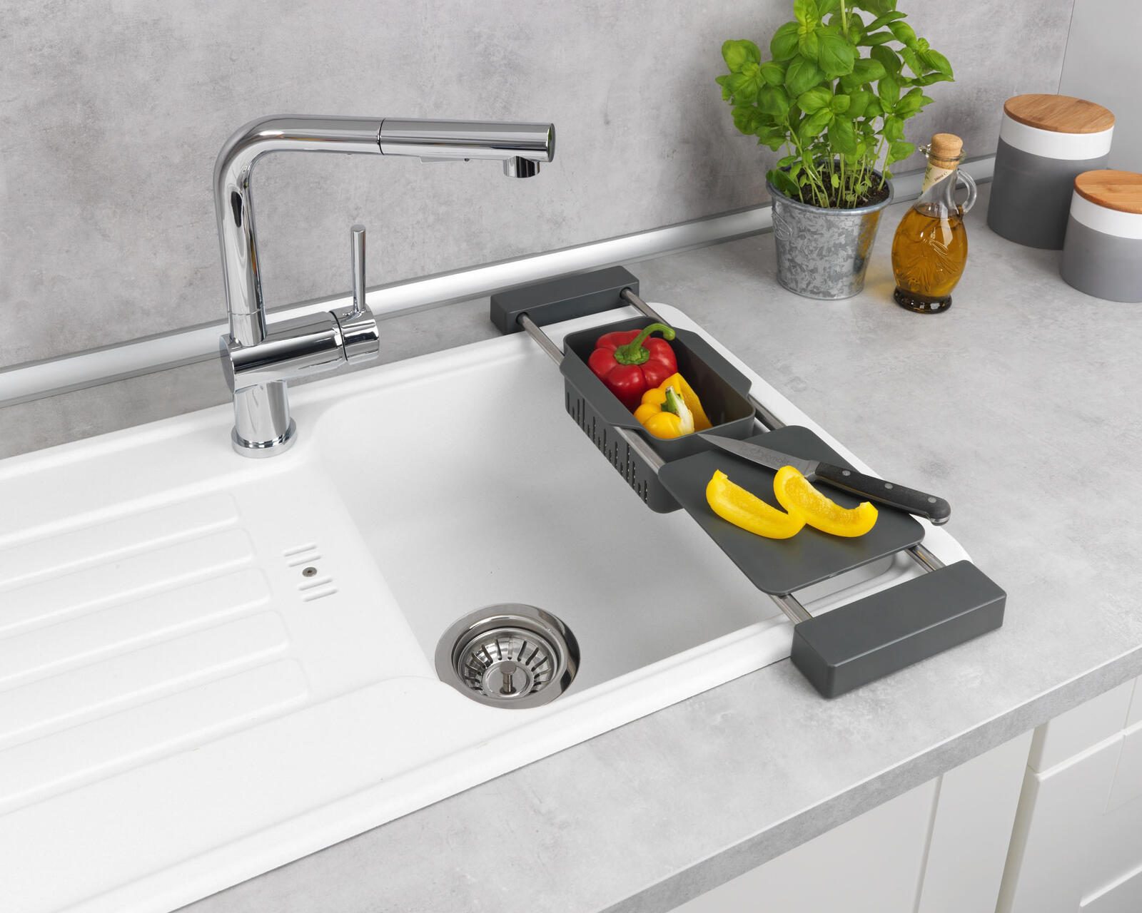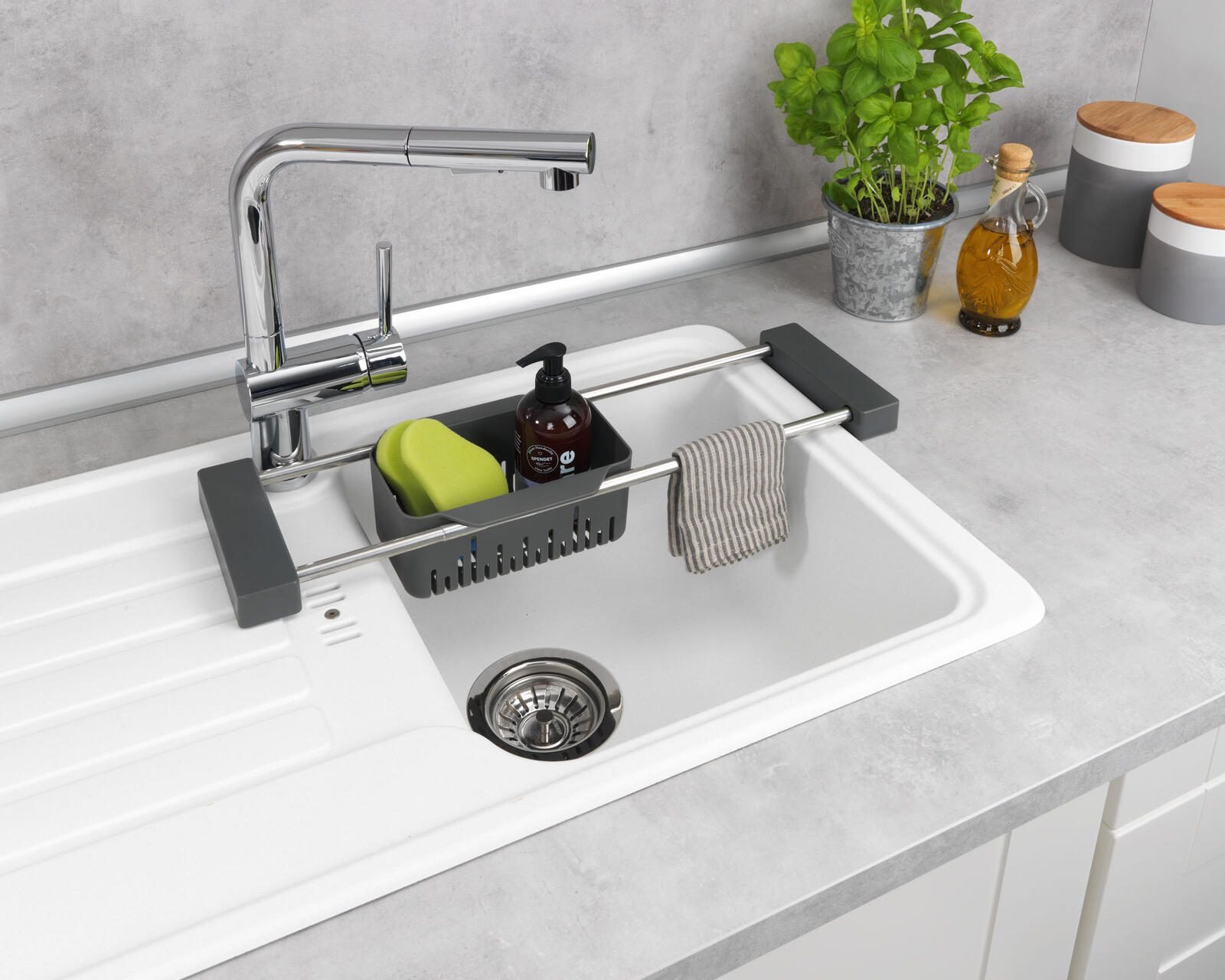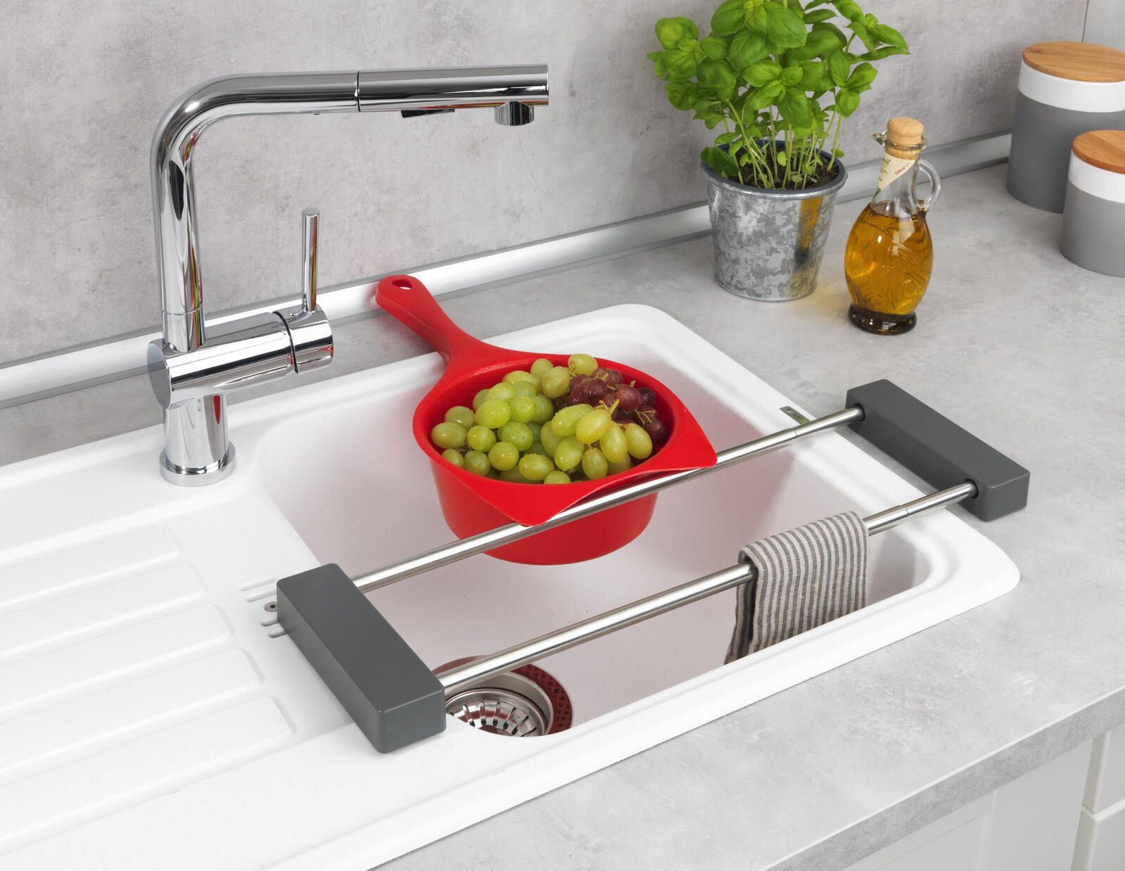 Der WENKO Cami Spülbecken-Organizer in elegantem Grau ist die perfekte Lösung für eine aufgeräumte und funktionale Küchenumgebung. Hergestellt aus hochwertigem Polypropylen (PP), bietet dieser Organizer nicht nur eine ansprechende Optik, sondern auch eine hohe Lebensmittelsicherheit, sodass du ihn bedenkenlos für deine Küchenutensilien verwenden kannst. Mit einem cleveren Design, das die Ablagefläche als zusätzliches Schneidebrett nutzt, wird der Organizer zu einem vielseitigen Helfer in deiner Küche. Der integrierte Korb kann gleichzeitig als Sieb verwendet werden, was dir das Abtropfen von Lebensmitteln erleichtert. Die ausziehbare Funktion von 43,5 bis 77,5 cm ermöglicht eine flexible Anpassung an verschiedene Spülbeckenbreiten, sodass der Organizer in nahezu jede Küche passt. Die Höhe von 8 cm sorgt dafür, dass der Organizer auch unter Hängeschränken problemlos Platz findet. Zudem ist der WENKO Cami Spülbecken-Organizer mit Anti-Rutsch-Füßen ausgestattet, die für einen sicheren Stand sorgen und ein Verrutschen während der Nutzung verhindern. In einem modernen Grauton gehalten, fügt sich der Organizer harmonisch in jede Kücheneinrichtung ein und verleiht deinem Spülbereich ein aufgeräumtes und stilvolles Aussehen. Der WENKO Cami Spülbecken-Organizer ist somit nicht nur funktional, sondern auch ein ästhetisches Highlight in deiner Küche.Technische Daten