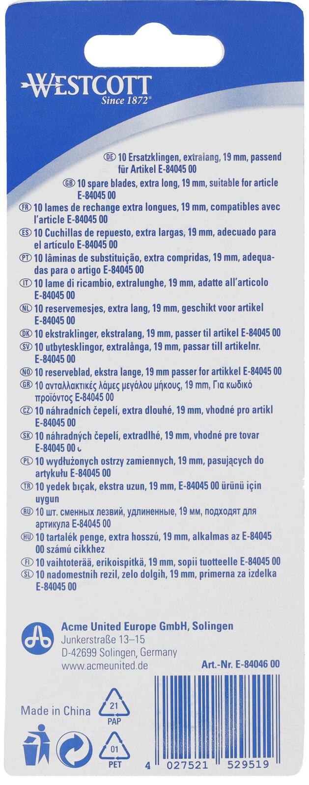 Die WESTCOTT Cuttermesser-Klingen in der Größe von 19 mm sind die ideale Ergänzung für deinen WESTCOTT Cutter E-84045. Diese hochwertigen Ersatzklingen bestehen aus robustem Stahl und bieten eine hervorragende Schneidleistung, die es dir ermöglicht, präzise und saubere Schnitte durchzuführen. Egal, ob du Papier, Karton oder andere Materialien bearbeitest, diese Klingen sind für vielfältige Anwendungen geeignet und garantieren eine lange Lebensdauer. Die Lieferung umfasst 10 extra lange Klingen, die sicher in einer praktischen Kunststoffbox verpackt sind. So hast du immer einen Vorrat an frischen Klingen zur Hand, wenn du sie benötigst. Der silberne Farbton der Klingen verleiht ihnen nicht nur ein ansprechendes Aussehen, sondern sorgt auch dafür, dass sie sich harmonisch in dein Werkzeugarsenal einfügen. Die WESTCOTT Cuttermesser-Klingen E-84046 sind speziell für den WESTCOTT Cutter E-84045 konzipiert, was eine perfekte Passform und optimale Leistung gewährleistet. Du kannst dich auf die Qualität und Präzision der WESTCOTT Produkte verlassen, die für ihre Langlebigkeit und Effizienz bekannt sind. Mit diesen Ersatzklingen bist du bestens ausgestattet, um deine Projekte effizient und professionell zu realisieren. Vertraue auf die bewährte Qualität von WESTCOTT und erlebe, wie einfach und effektiv das Schneiden mit diesen Klingen sein kann.Technische Daten