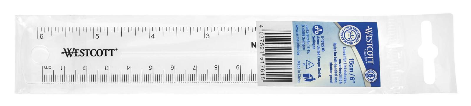 Das WESTCOTT Lineal 15 cm ist ein unverzichtbares Werkzeug für jeden Linkshänder. Mit seiner transparenten Farbe ermöglicht es dir eine präzise Sicht auf das Papier, während du zeichnest oder misst. Dieses spezielle Linkshänderlineal ist so konzipiert, dass es den Bedürfnissen von Linkshändern gerecht wird und dir ein komfortables Arbeiten ermöglicht. Das Lineal besteht aus bruchsicherem Kunststoff, was es besonders langlebig und widerstandsfähig macht. Du kannst es problemlos in deiner Schultasche oder deinem Büro aufbewahren, ohne dir Gedanken über Beschädigungen machen zu müssen. Das Material sorgt zudem dafür, dass das Lineal leicht und handlich ist, was dir eine mühelose Handhabung ermöglicht. Ein weiteres praktisches Merkmal des WESTCOTT Lineals ist das integrierte Aufhängöse, mit dem du es einfach an einem Haken oder einer Pinnwand aufbewahren kannst. So hast du es immer griffbereit, wenn du es benötigst. Mit einer Länge von 15 cm ist es ideal für kleinere Projekte, sei es beim Zeichnen, Basteln oder im Schulunterricht. Das WESTCOTT Lineal 15 cm vereint Funktionalität und Benutzerfreundlichkeit auf perfekte Weise. Es ist speziell für Linkshänder geeignet und bietet dir die Möglichkeit, deine kreativen Ideen präzise umzusetzen. Genieße die Vorteile eines hochwertigen Lineals, das dir das Arbeiten erleichtert und gleichzeitig deinen individuellen Bedürfnissen gerecht wird.Technische Daten